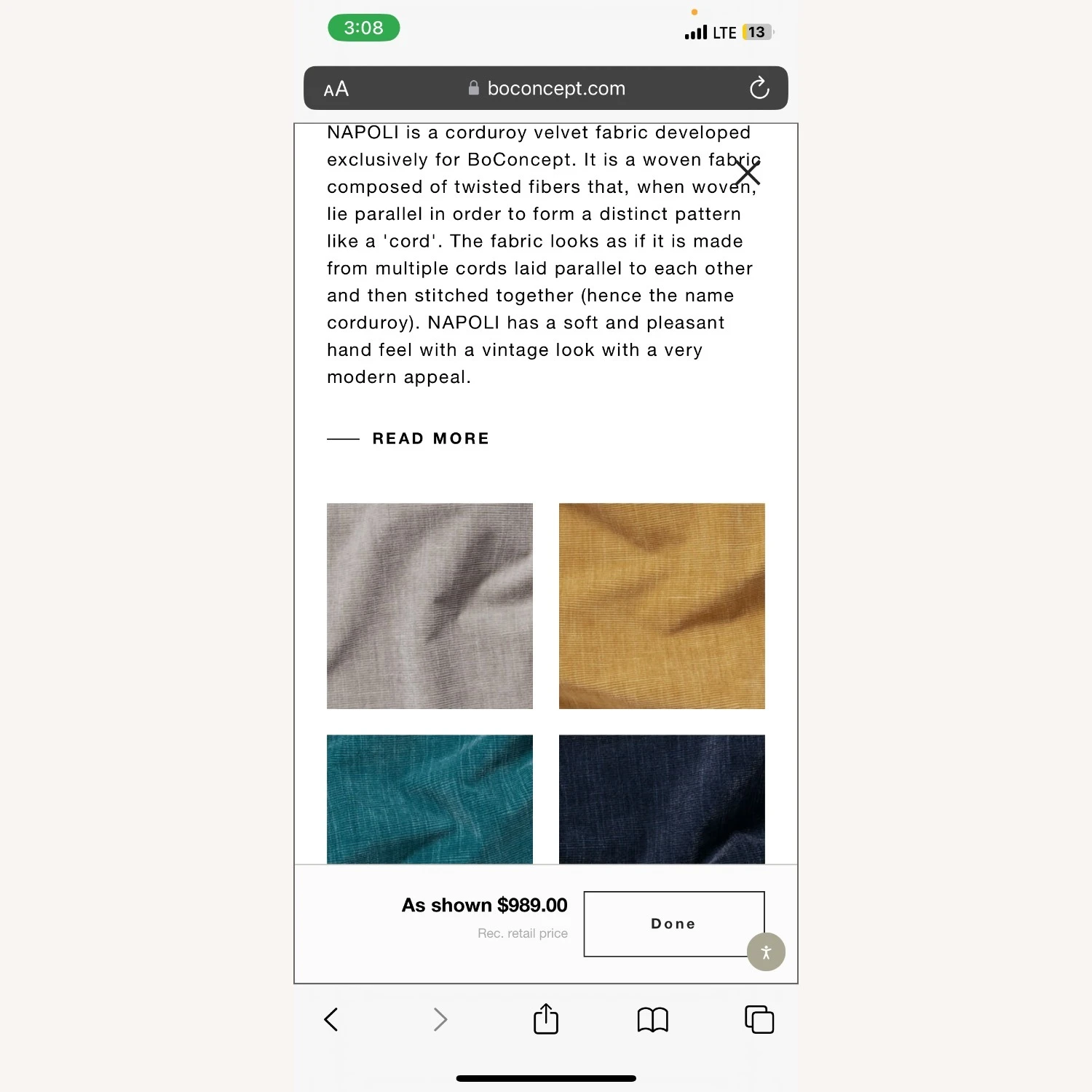 NAPOLI is a corduroy velvet fabric developed exclusively for BoConcept. It is a woven fabric composed of twisted fibers that, when woven, lie parallel in order to form a distinct pattern like a ‘cord’. The fabric looks as if it is made from multiple cords laid parallel to each other and then stitched together (hence the name corduroy). NAPOLI has a soft and pleasant hand feel with a vintage look with a very modern appeal.