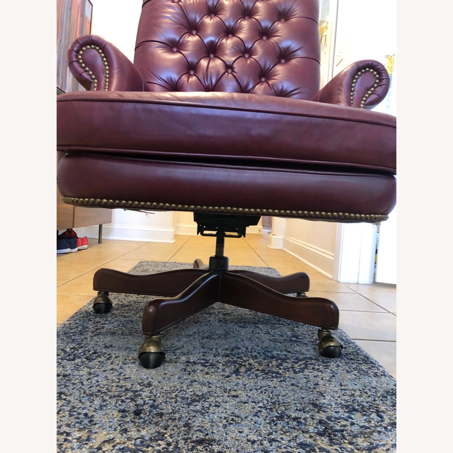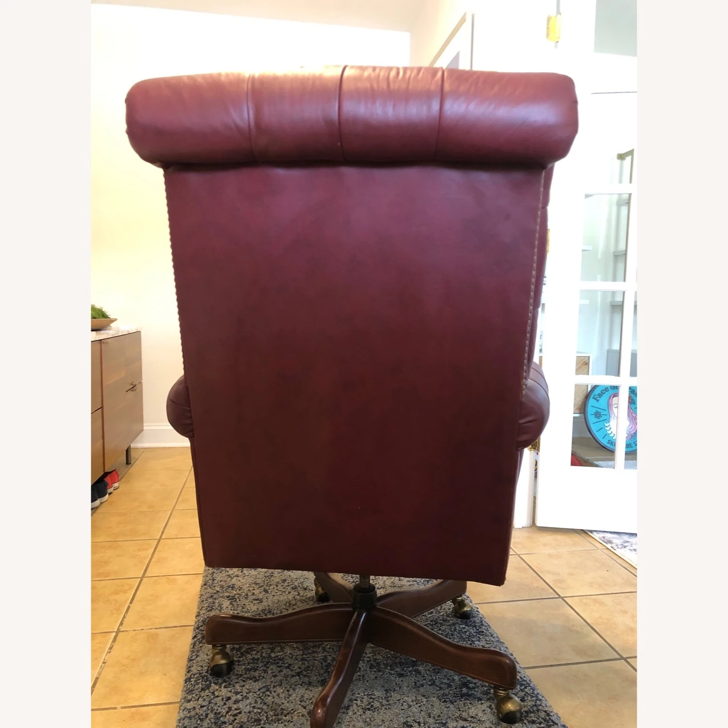 Seller’s Notes: Lushly crafted and entirely handmade by master craftsmen in North Carolina. Top grain leather and special cushioning carefully selected to retain their shape while remaining soft and comfortable. Springs hand-tied for increased durability. Nail head trim. The wood is maple, handcarved and hand-sanded to a silky touch. Not only does this chair swivel side-to-side and tilt front-to-back, but also it is adjustable in height. Brass casters. Handmade in America. Color is Crimson.