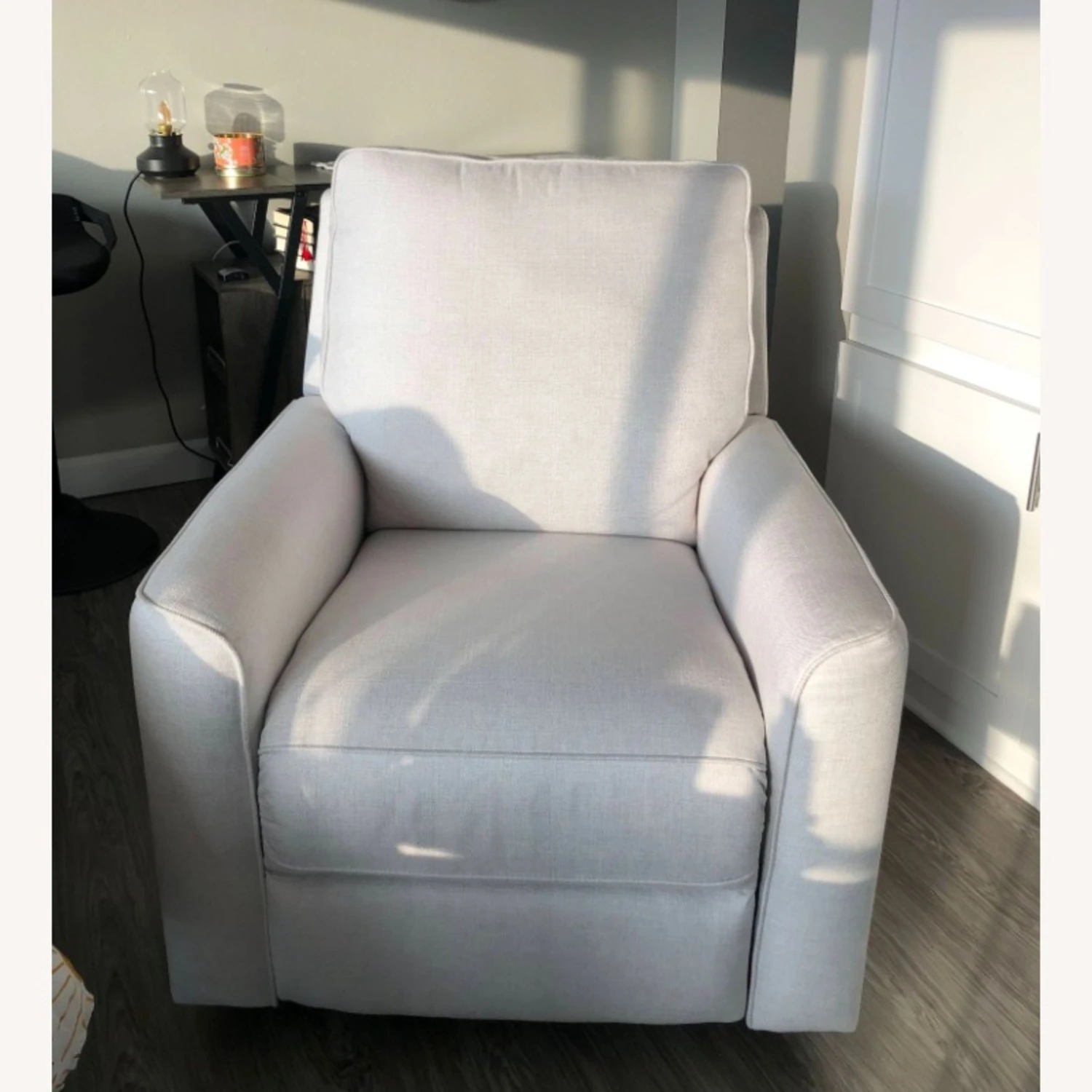 Seller’s Notes: I bought this chair for my studio apartment exactly a year ago! I’ve kept it really clean — pretty much been covered with a blanket but may have really small stains from me just living around it. I recently got a couch so I don’t need the chair anymore. It is very comfortable and swivels all the way around, as well as rocks and reclines.