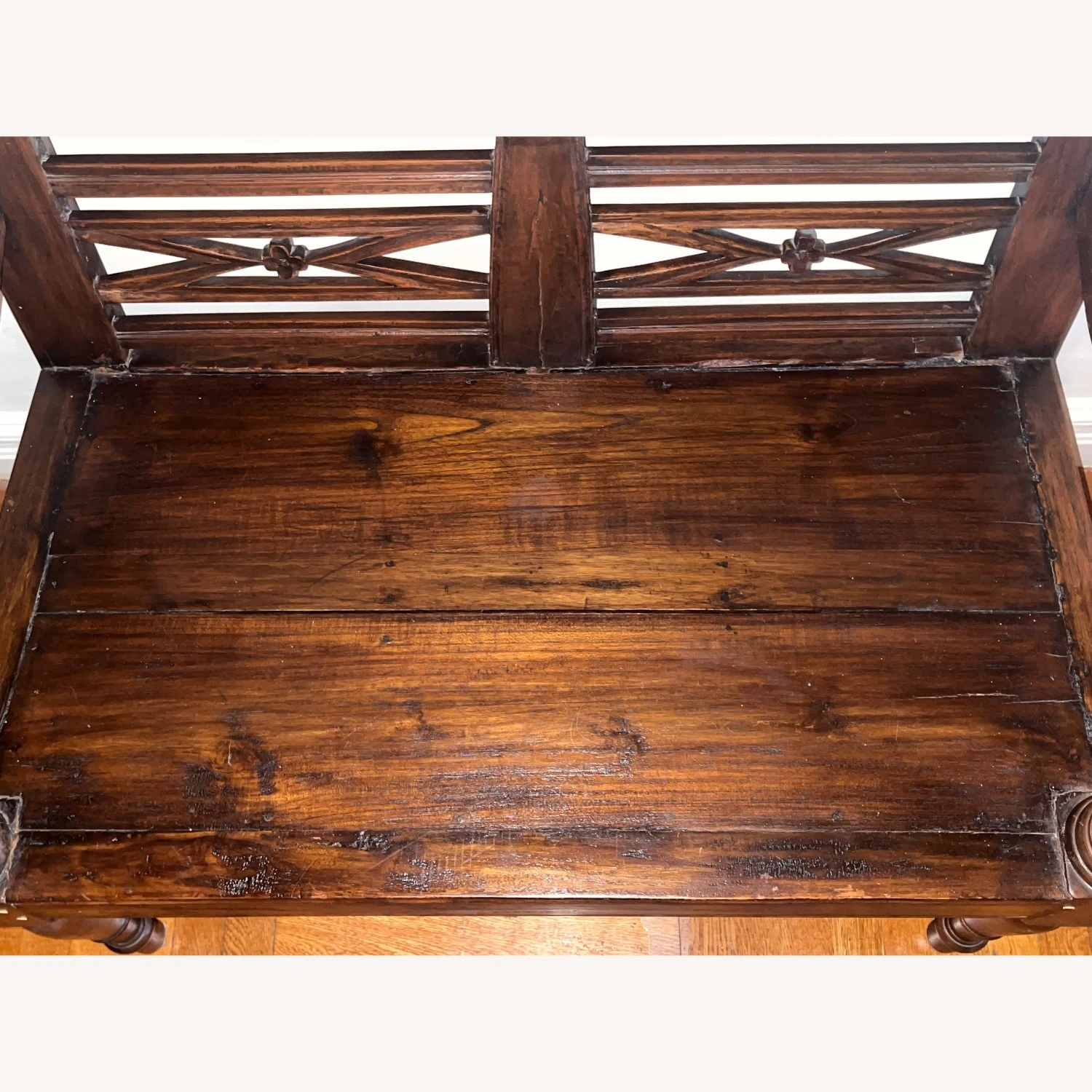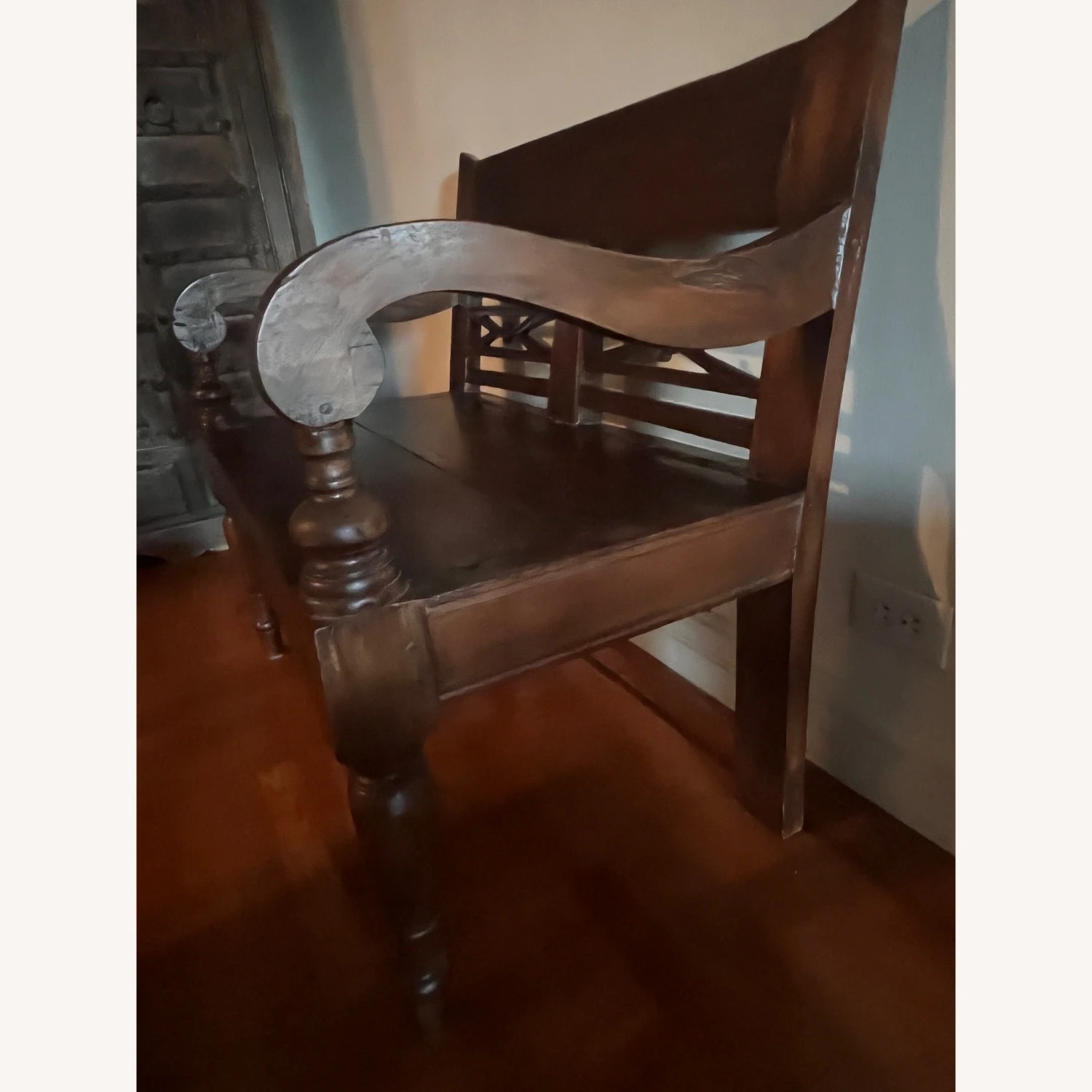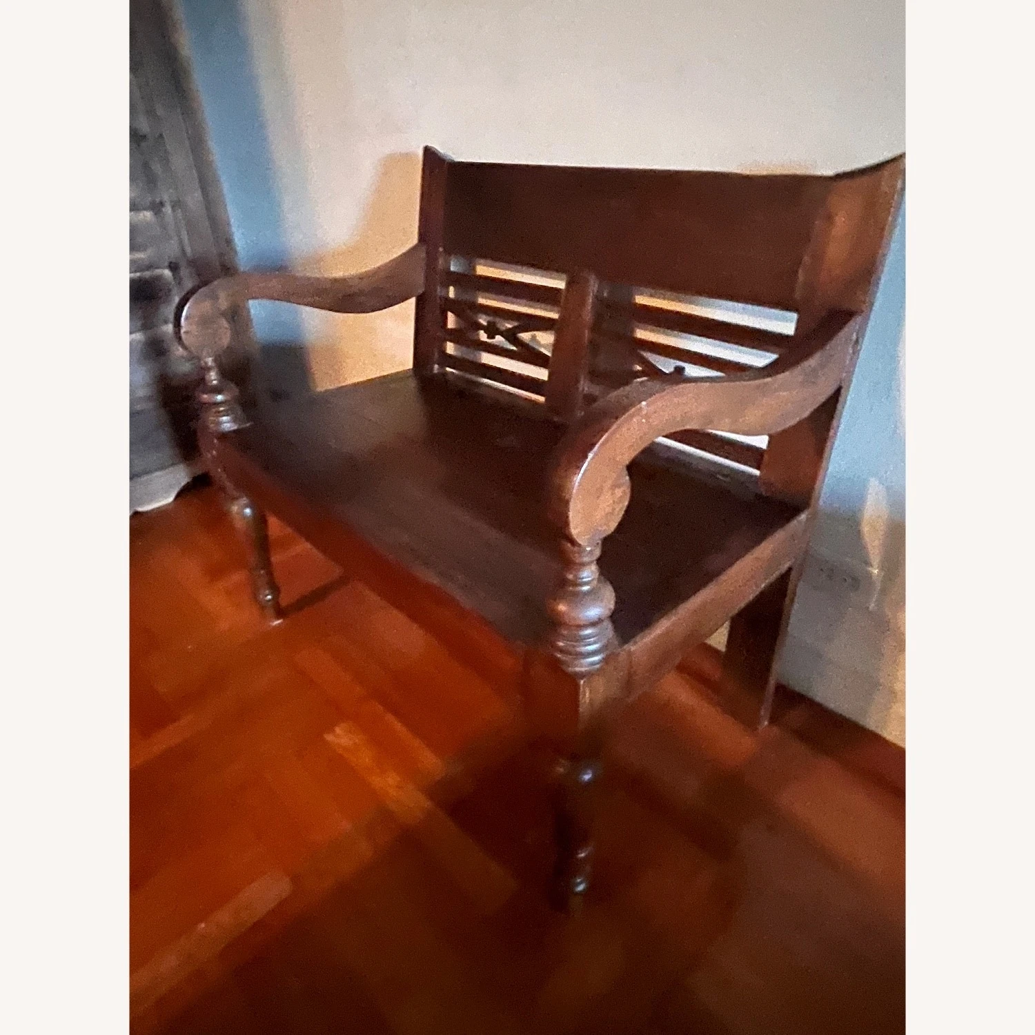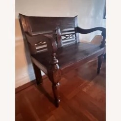 Seller’s Notes: This bench was bought at ABC Carpet. It’s originally from Indonesia. A beautiful dark stained teak wood. Solid.