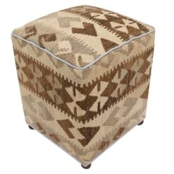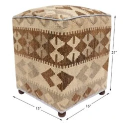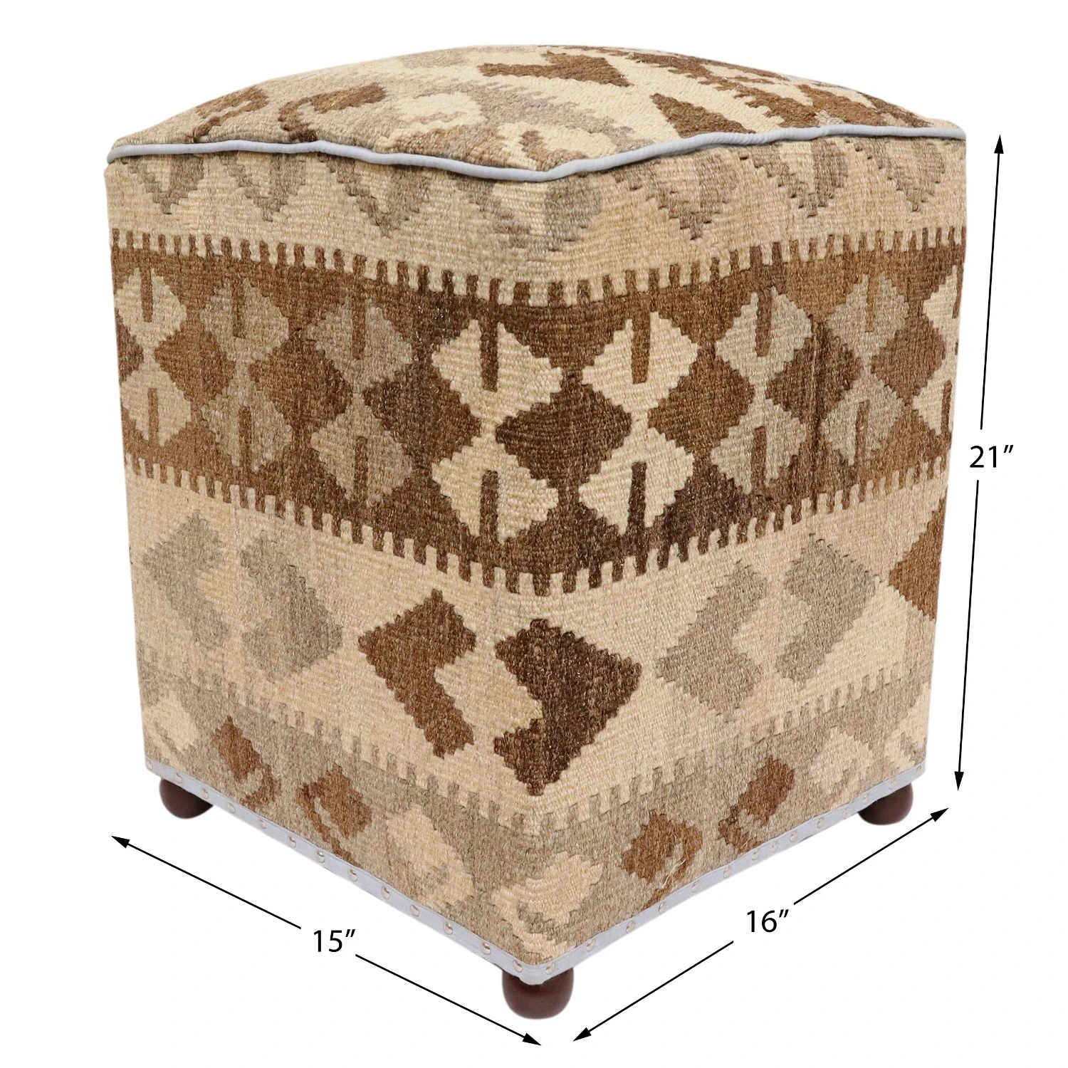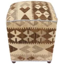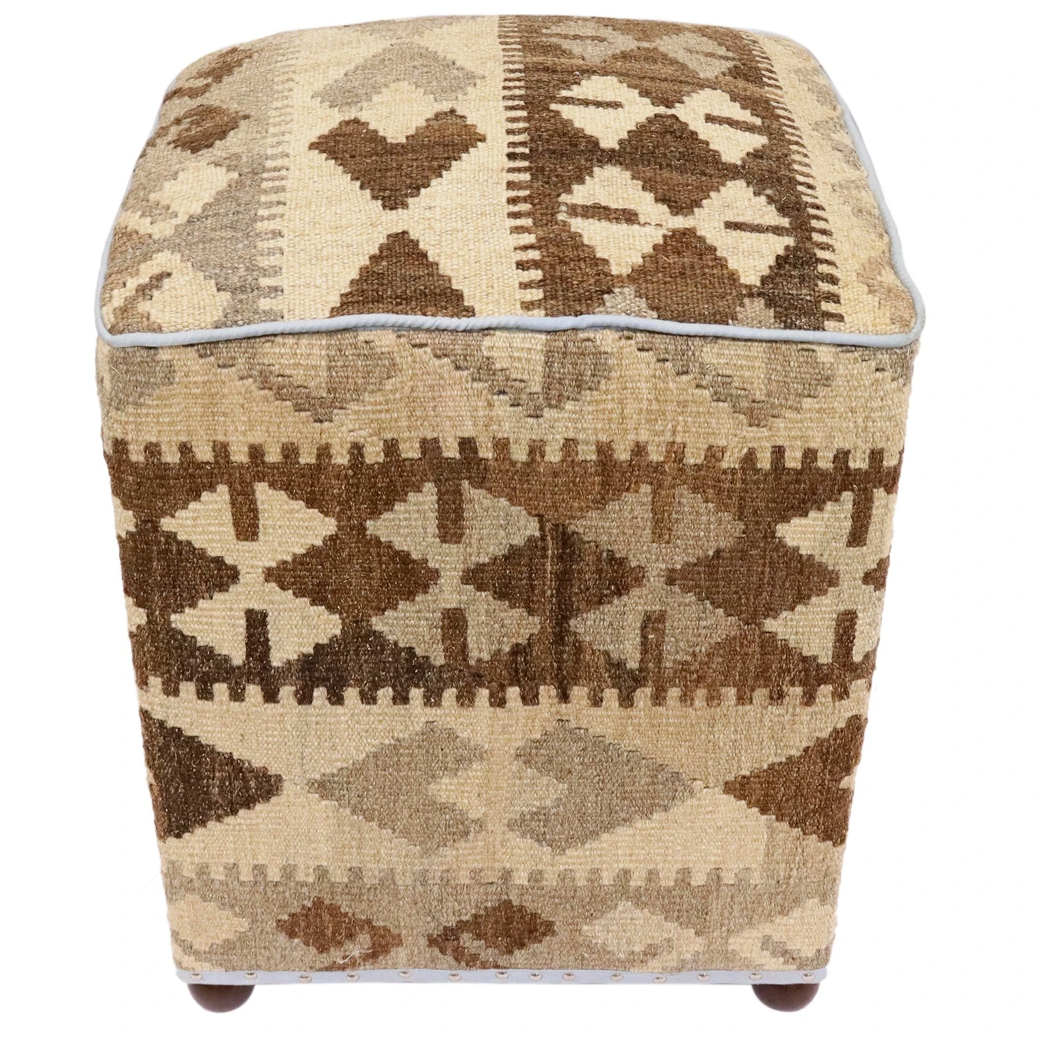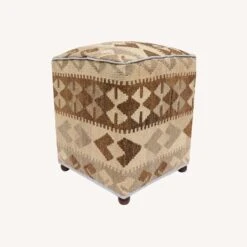 Seller’s Notes: Chic handmade ottoman crafted using wood and upholstered using hand-woven kilim wool rug is a multi-purpose fashion pouf which will add dimension, color and style to your decor. Inspired by geometric motifs in any array of effervescent color pallet grounds any space with elegance and sophistication.