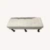 • Resting atop a splayed black birchwood frame with gold metal end caps, this bench is a striking addition to the home or apartment.