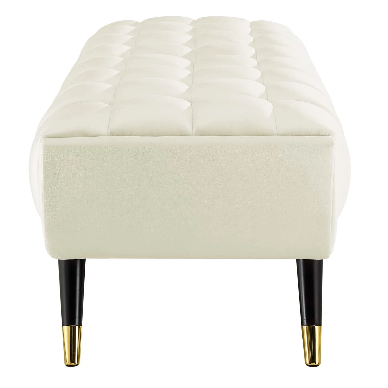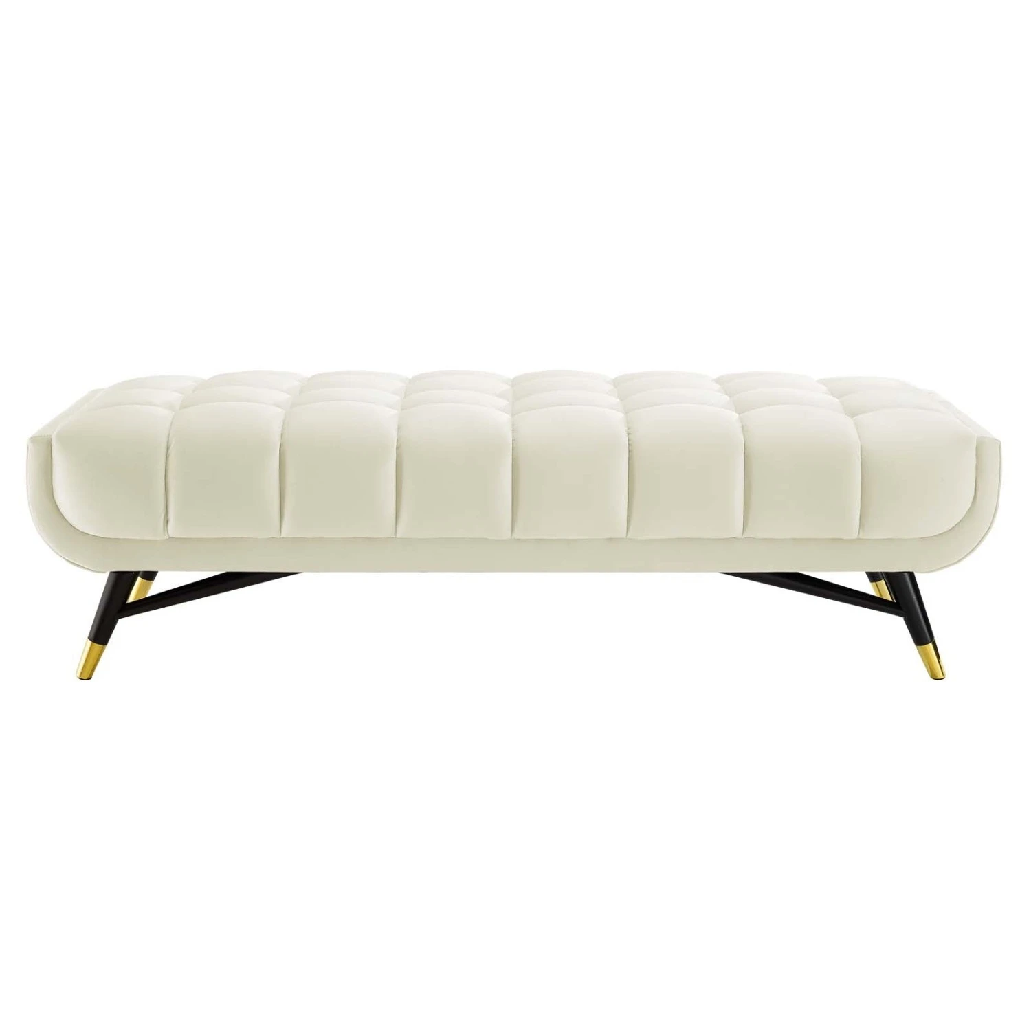 • Featuring a blend of chic, contemporary, and mid-century modern design, this bench’s broad profile, generous tufting, stain-resistant performance velvet polyester upholstery, and subtle metal accents imbue rich detail and chic sophistication.