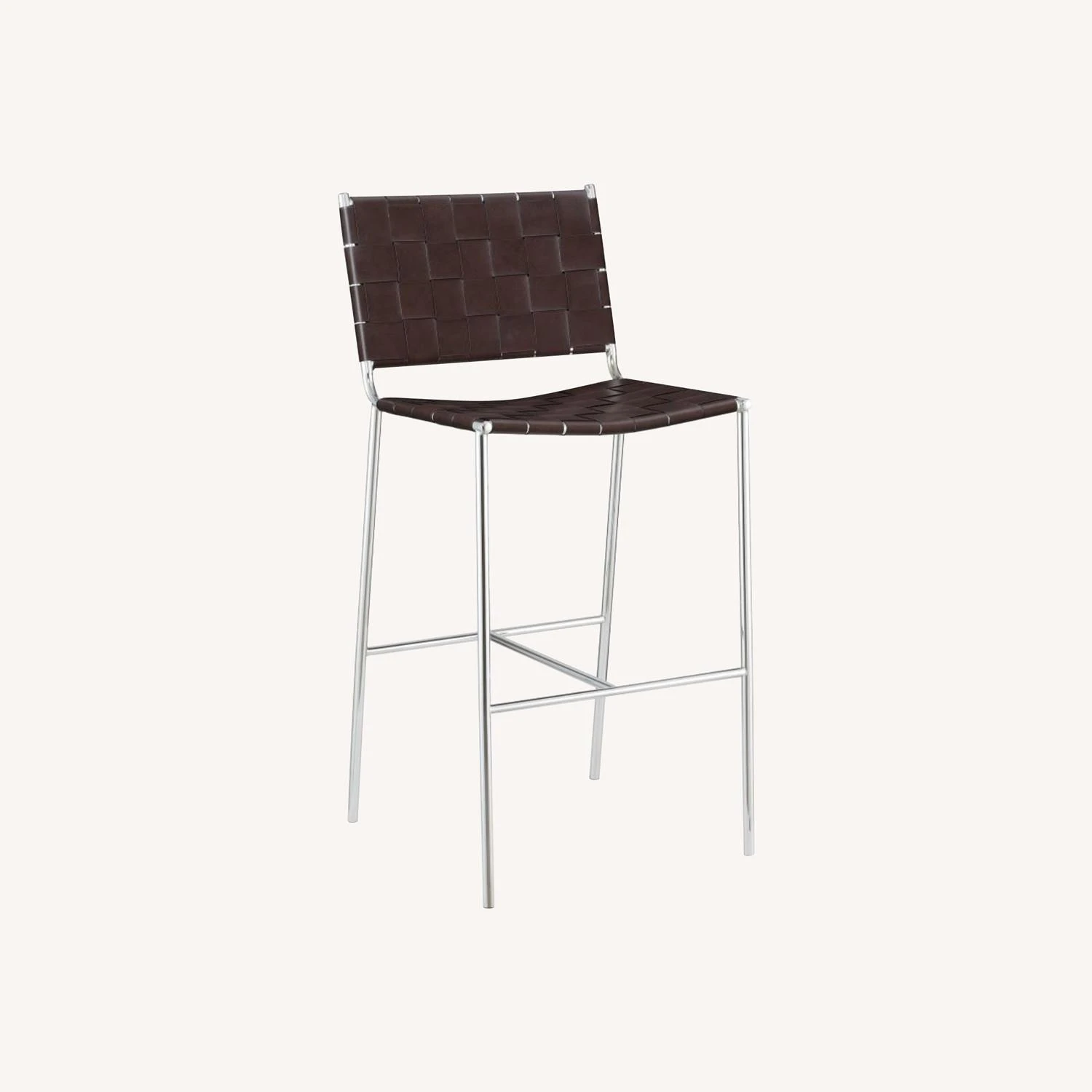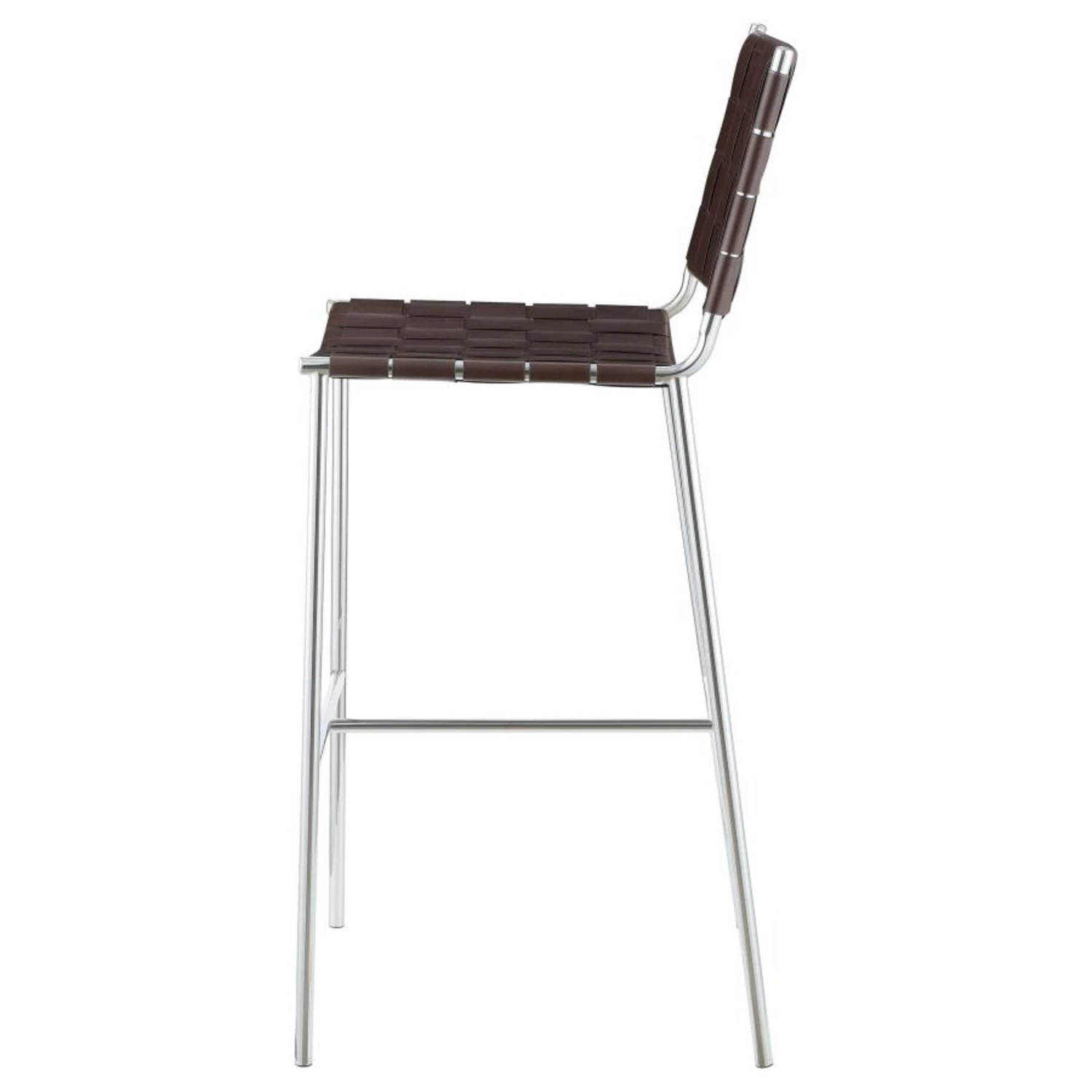 • Narrow leatherette bands weave together to create a backrest and seat, supported by the metal frame. Slender legs extend to the floor, connected with an H-shape footrest trestle design.