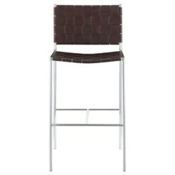 • A slim metal frame in a gleaming chrome finish offers a striking contrast against the brown faux leather accents.