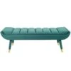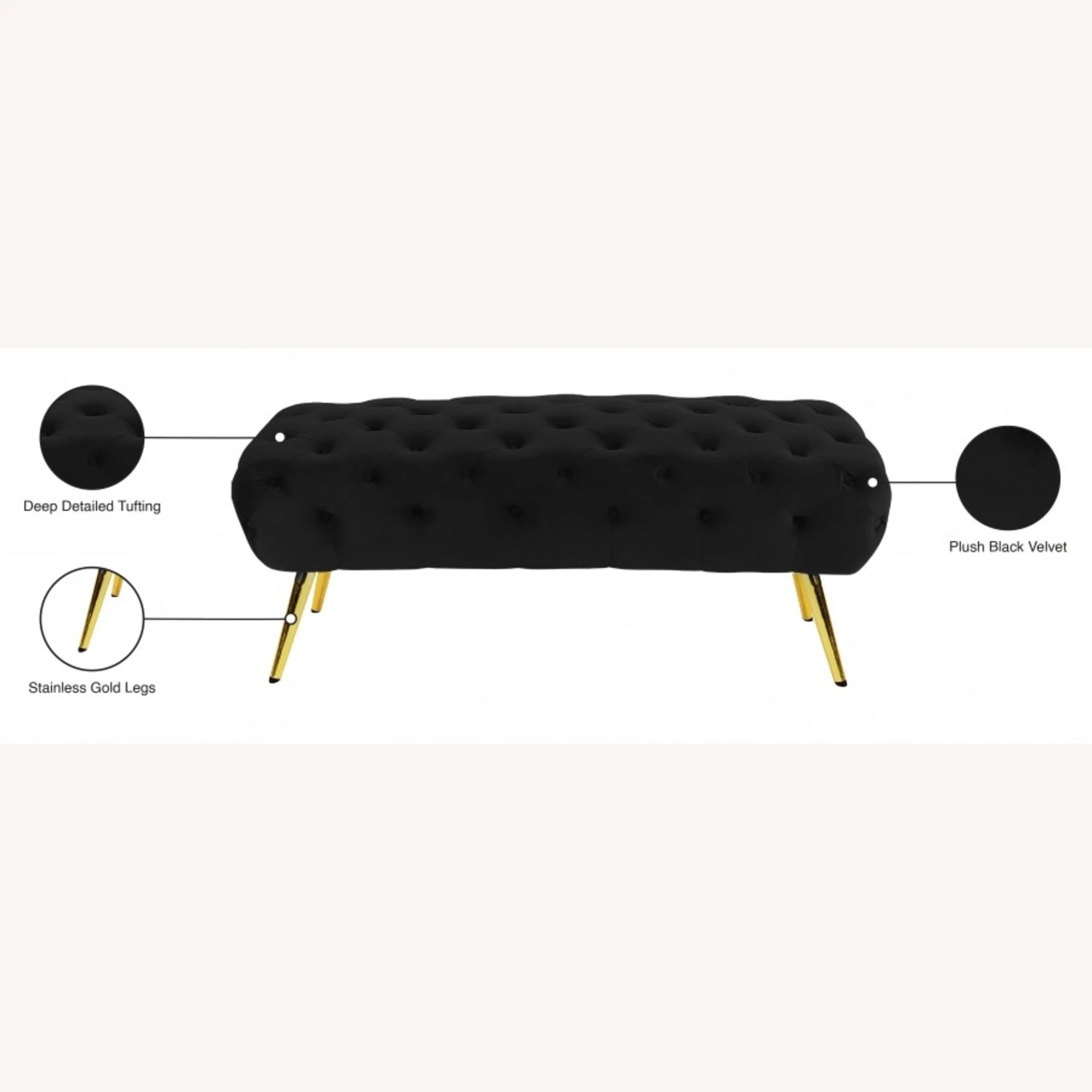 • Its rich velvet upholstery gives it a sleek, modern look while stainless steel legs with a gold finish add to its lavish appearance.