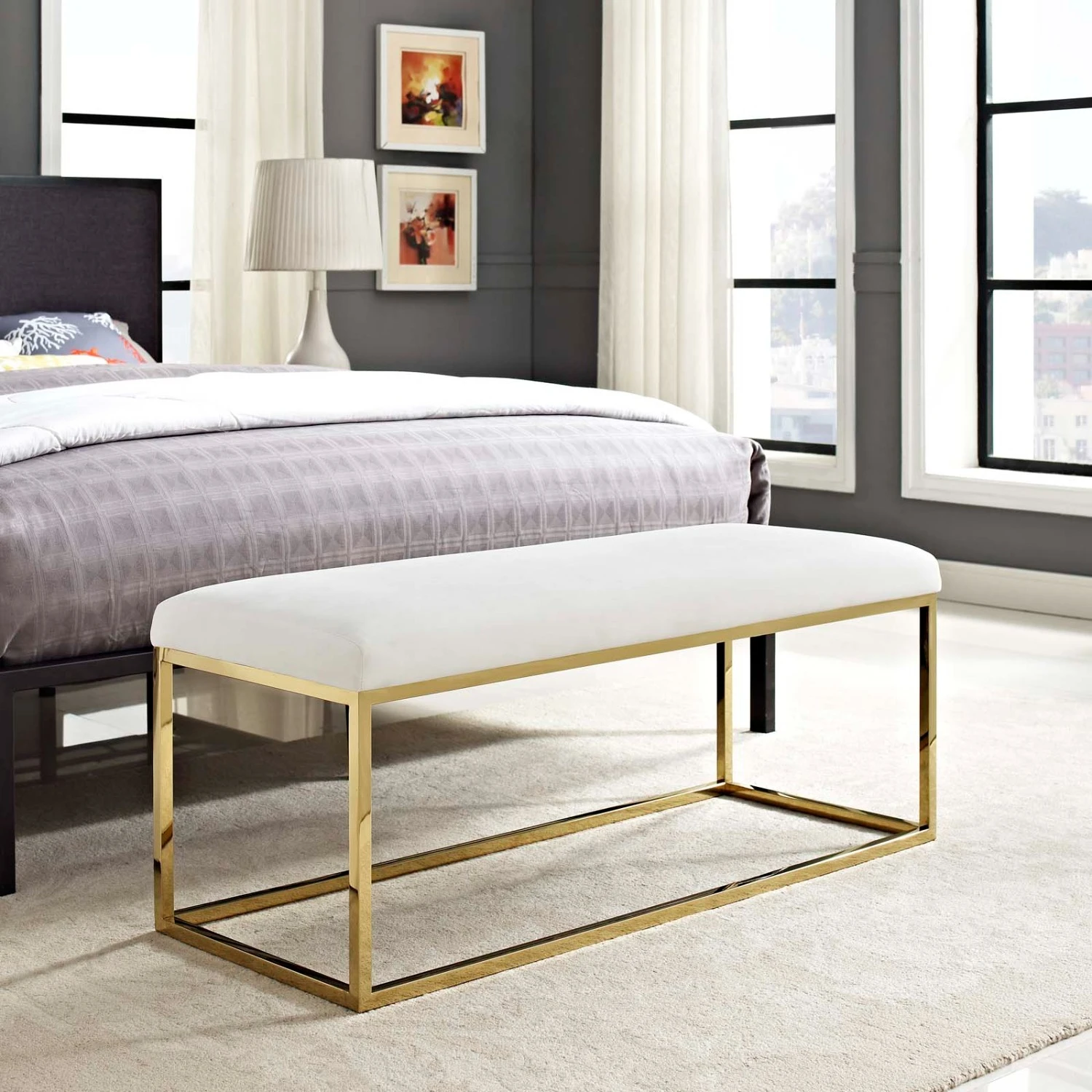 • Make a statement with this bench. Brimming with clean lines and a sleek modern look, this features a polished stainless steel base, elegant velvet polyester fabric top, and non-marking foot caps that help protect your flooring.