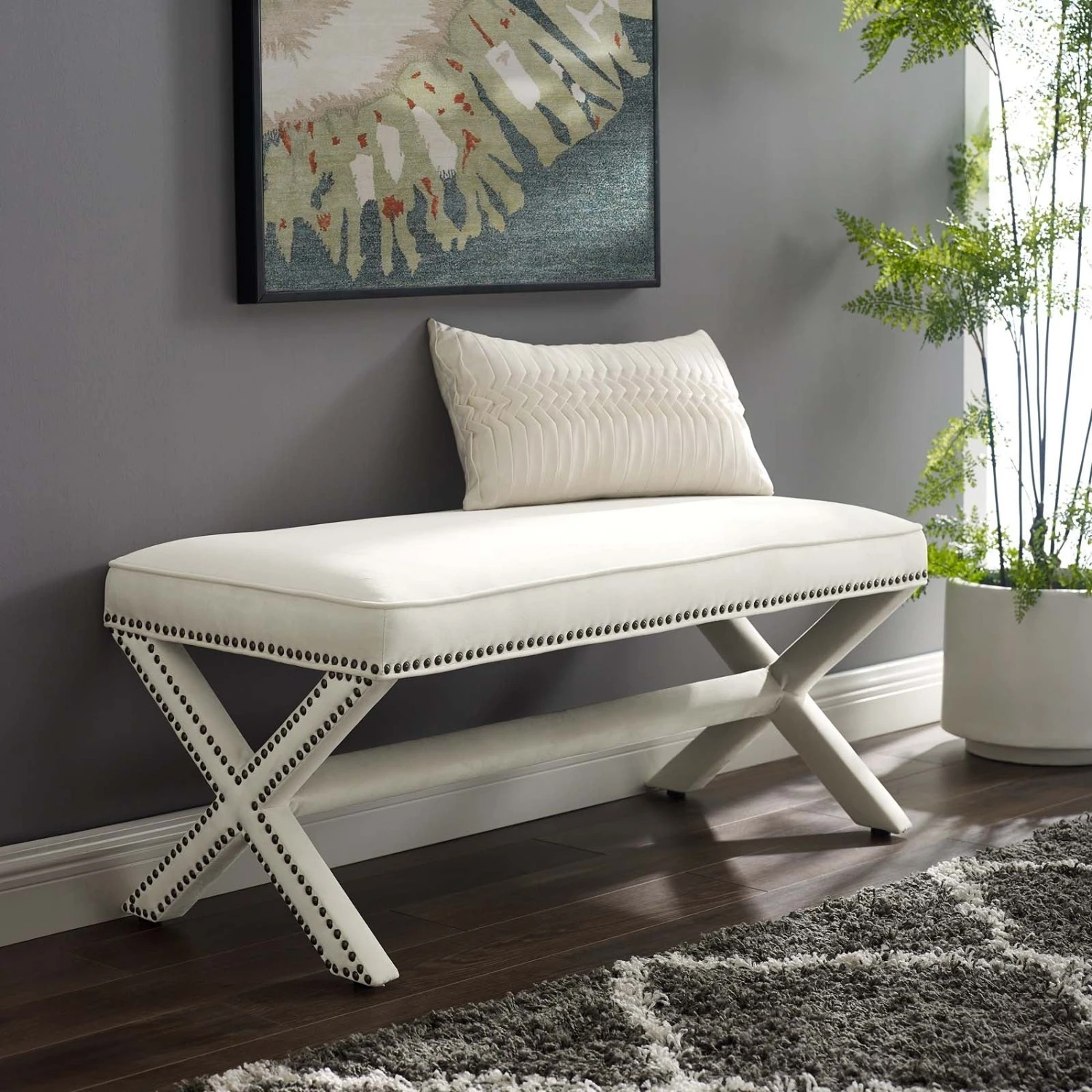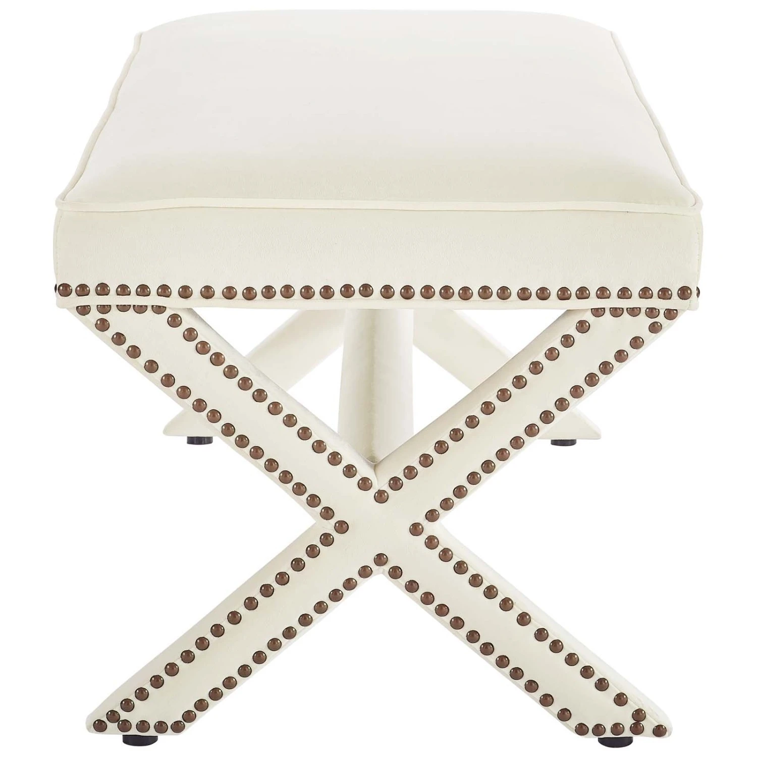 • Featuring timeless nail head trim, an elegant X-base frame, and surrounded by stain-resistant performance velvet fabric with dense foam padding, this bench is a perfectly soft and cozy bench for the chic modern lifestyle.