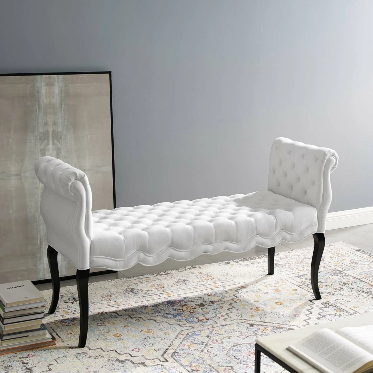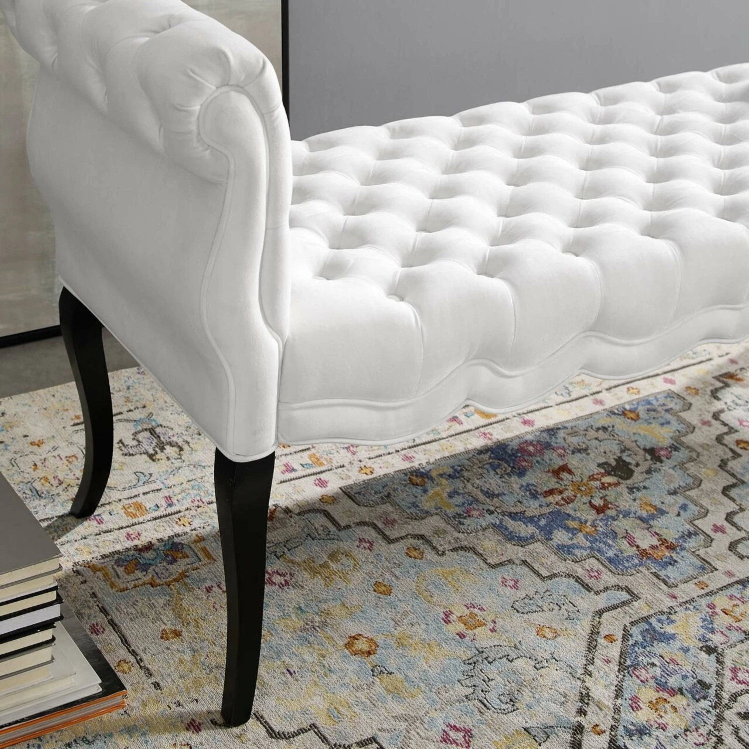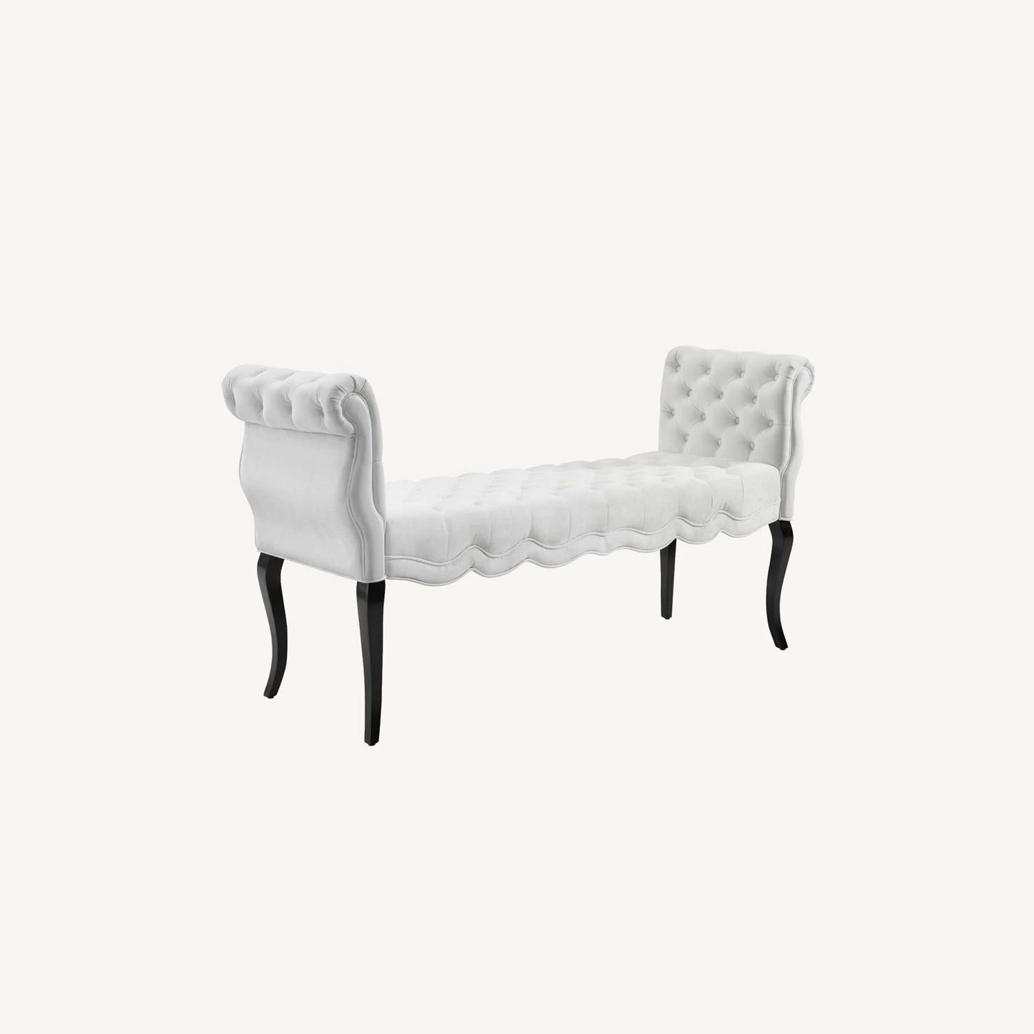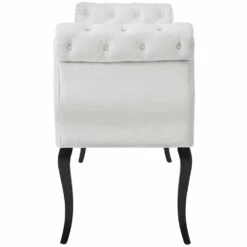 • A beautiful accent or extra seating solution, this entryway bench features deep button tufting, rolled armrests, delicate piping, and dense foam padding for a comfortable, supportive place to rest.