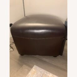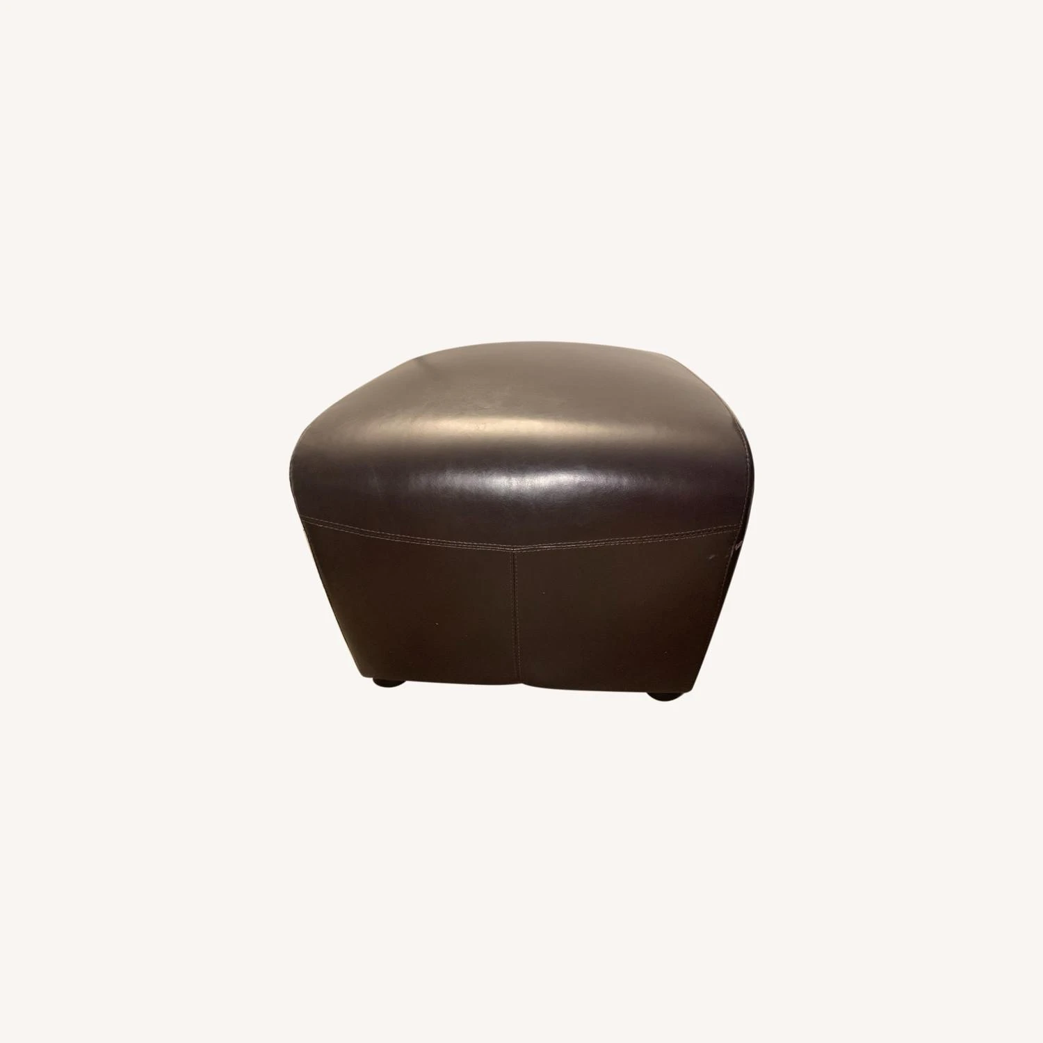 Seller’s Notes: Brown faux-leather ottoman in good condiiton. There are some paint stains on one side (see photos) that can likely be removed as well as a tear in the underside lining. Otherwise item is in relatively good condition.