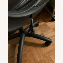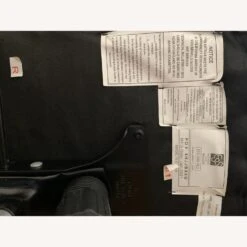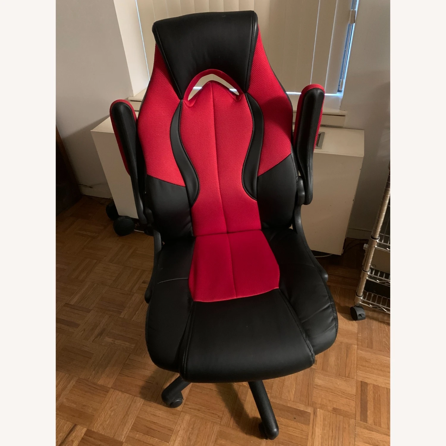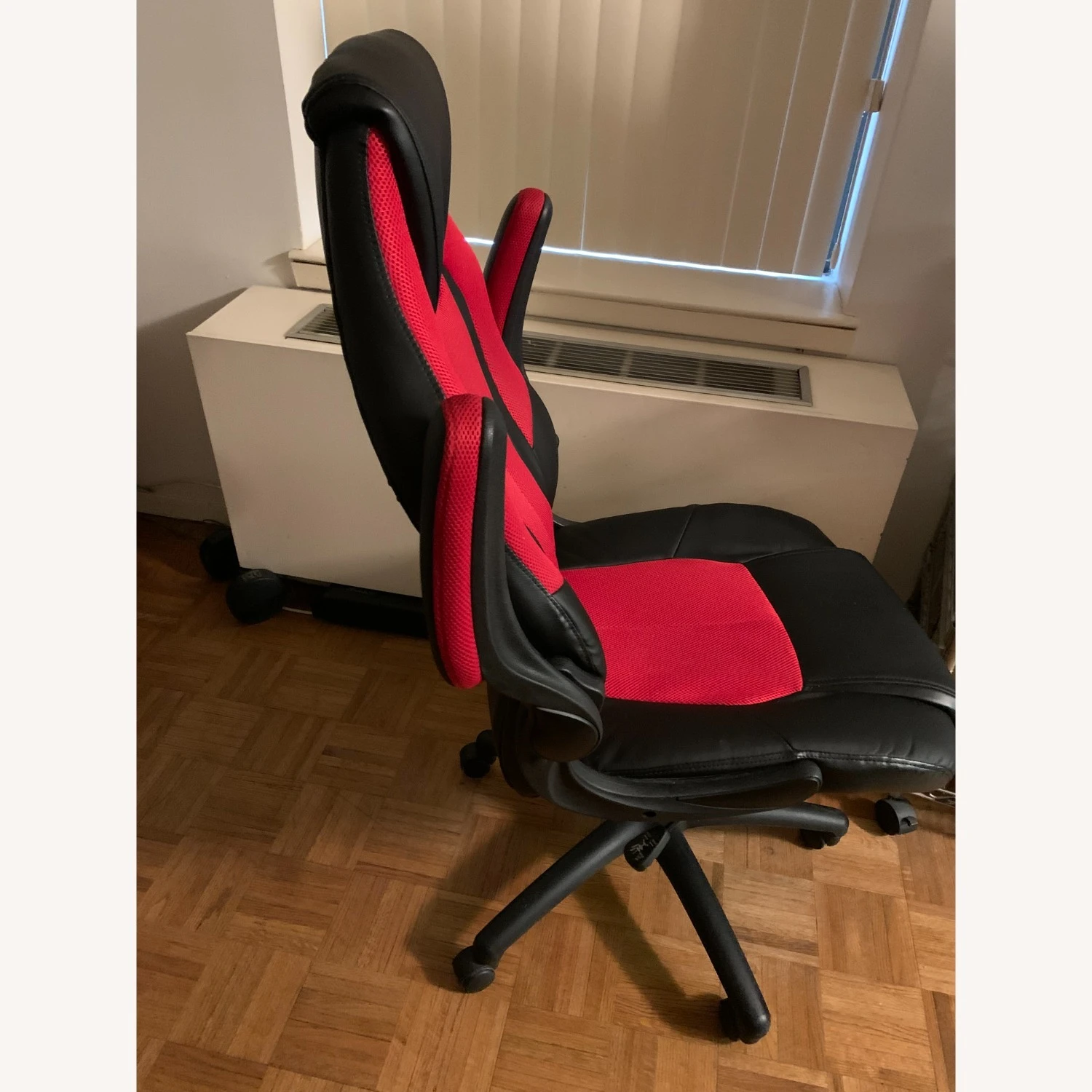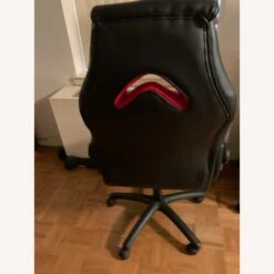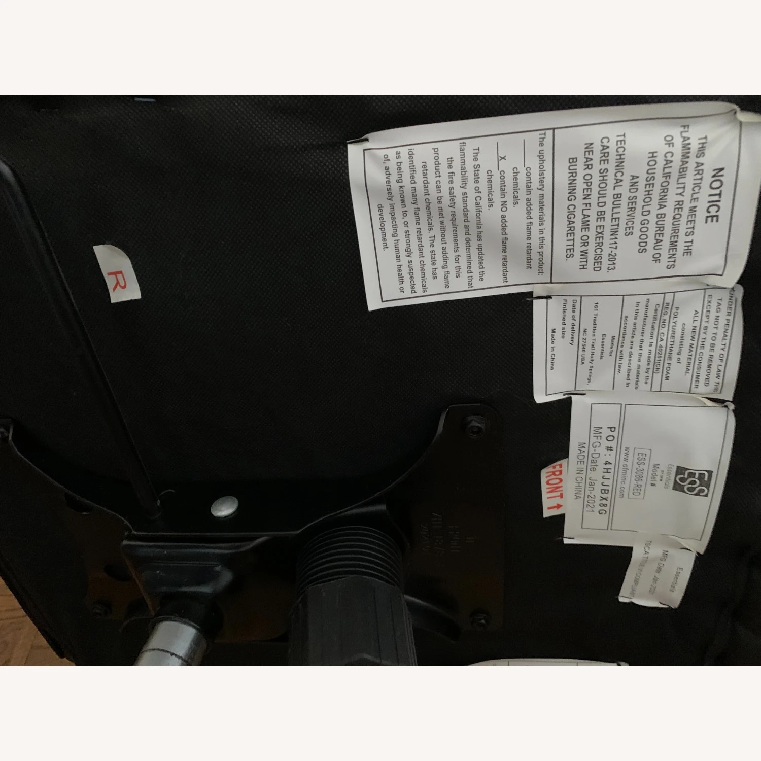 Seller’s Notes: High-back racing style, bonded vinyl like-leather look and mesh material. Large seat, chair is good for long legs or tall person. Brand: see the labels in photo, ESS Essentials. Wheels, adjustable height, arms move up or down as seen in photos.