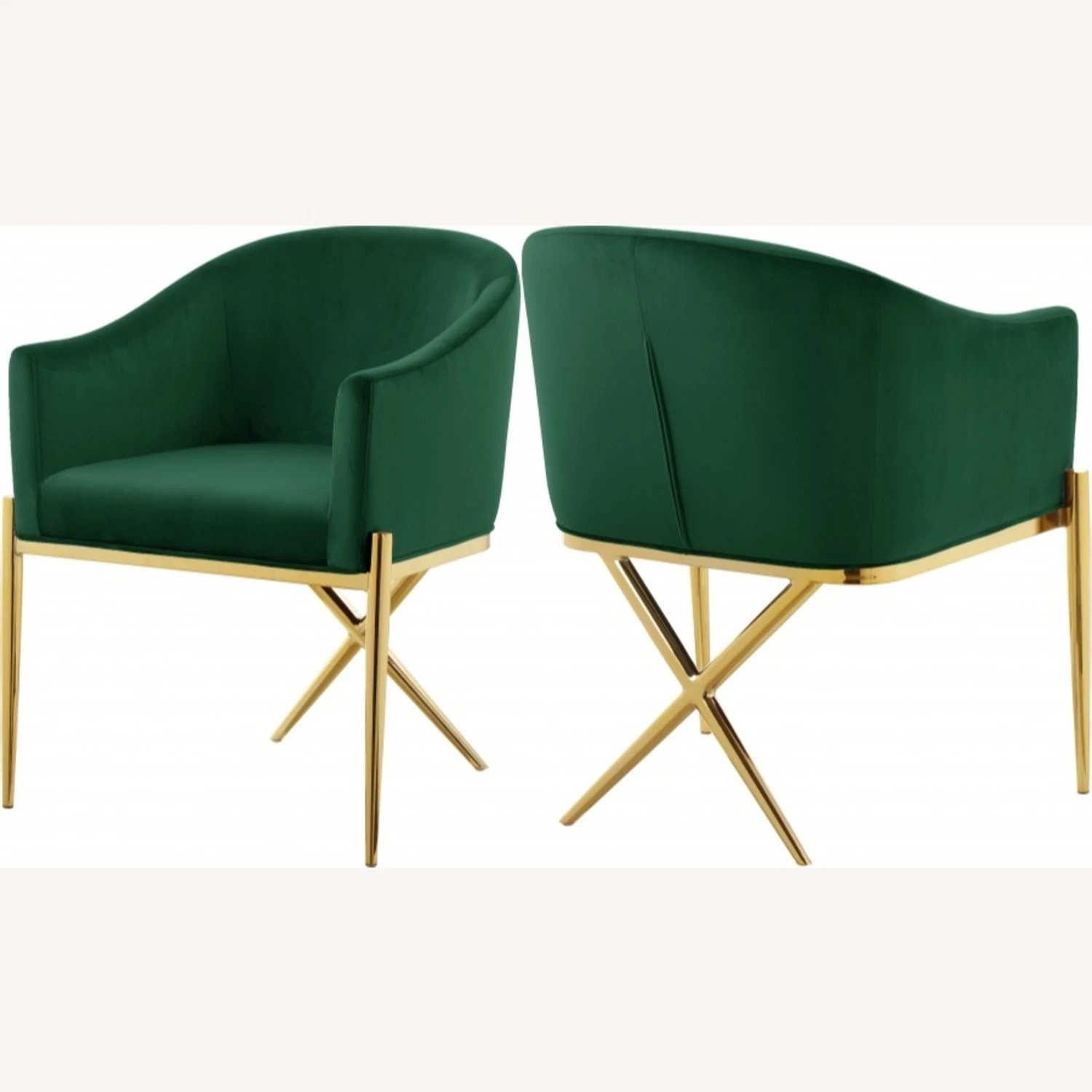 • Sleek green velvet upholstery is durable and tough yet soft against your body, elevating meal times to a luxurious experience.
