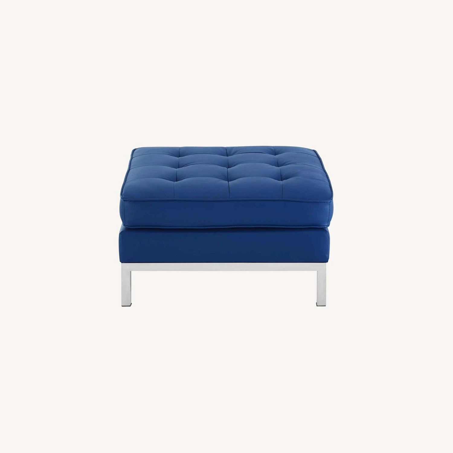 • This modern living room ottoman comes in a captivating linear design with an external tubular stainless steel frame, four stainless steel silver legs, and non-marking foot caps.