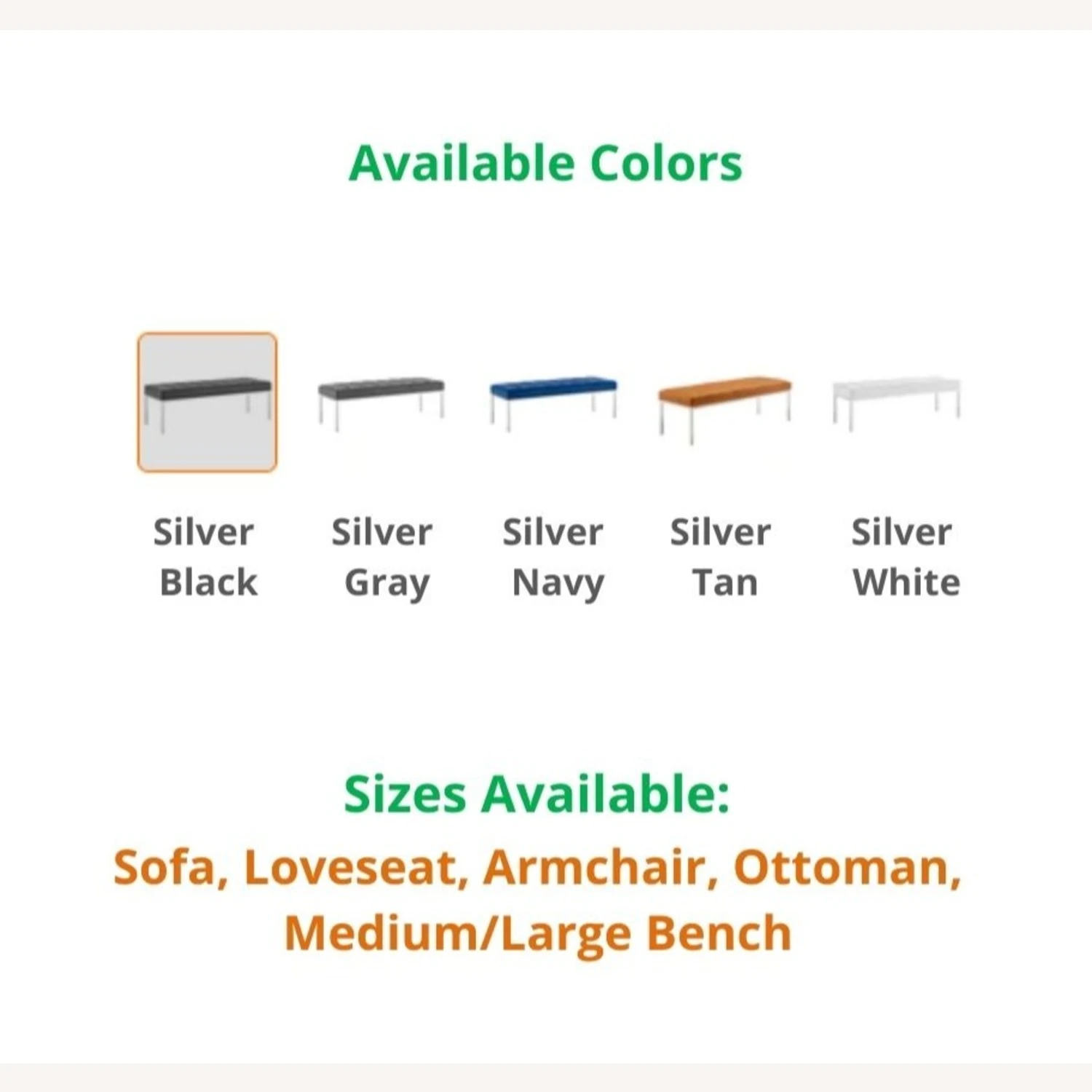 Seller’s Notes: BRAND NEW!! This model comes in these SILVER BLACK, SILVER GRAY, SILVER NAVY, SILVER TAN, and SILVER WHITE, and these sizes: SOFA, LOVESEAT, ARMCHAIR, OTTOMAN, and MEDIUM/LARGE BENCH. If you are interested in a color/size other than that of this listing, and if the quantity you wish to purchase is greater than what is listed here, please message us for availability.