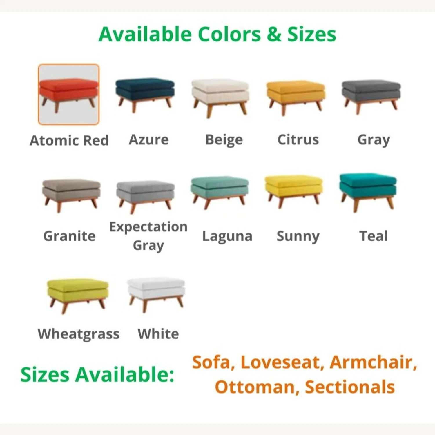 This model comes in these ATOMIC RED, AZURE, BEIGE, CITRUS, GRAY, GRNITE, EXPECTATION GRAY, LAGUNA, SUNNY, TEAL, WHEATGRASS, and WHITE, and these sizes: SOFA, LOVESEAT, ARMCHAIR, OTTOMAN, and SECTIONALS. If you are interested in a color/size other than that of this listing, and if the quantity you wish to purchase is greater than what is listed here, please message us for availability.