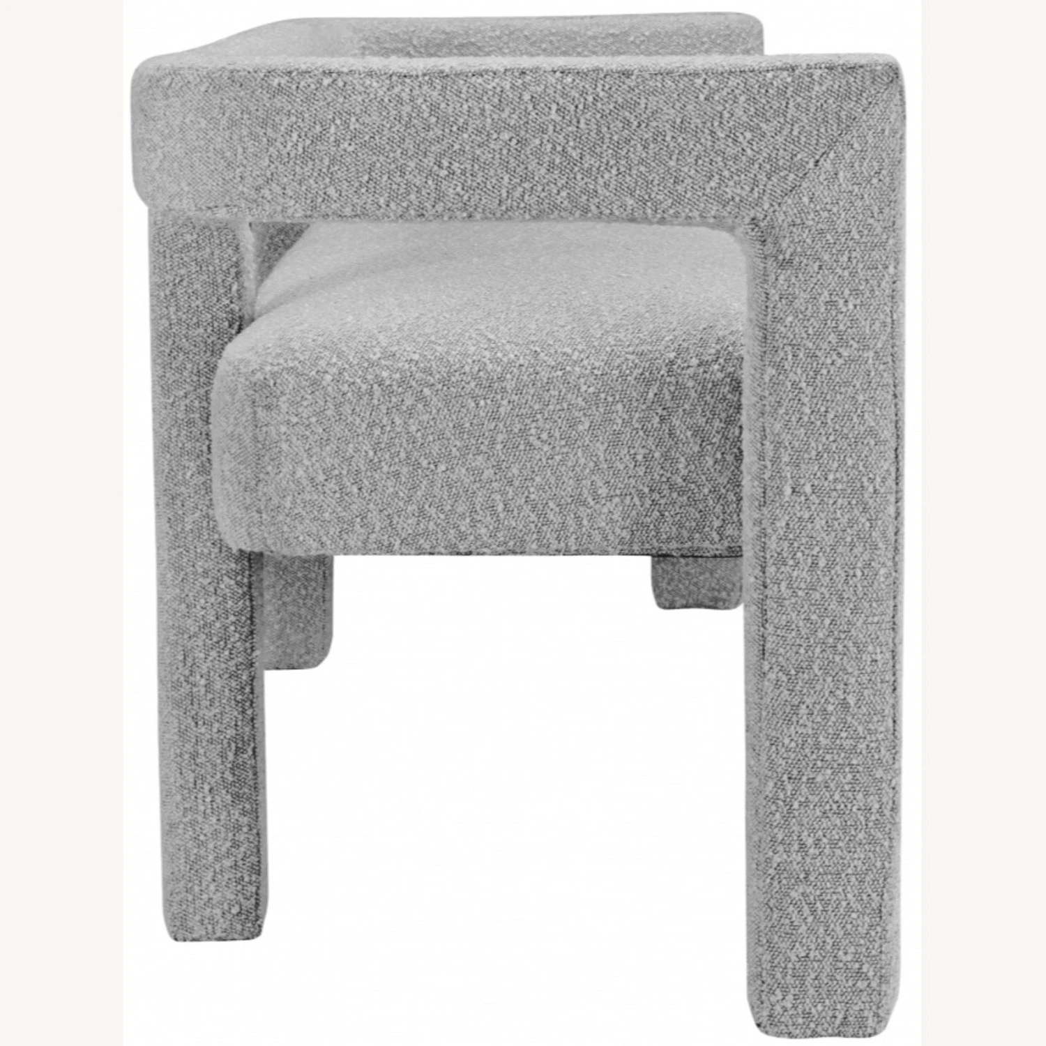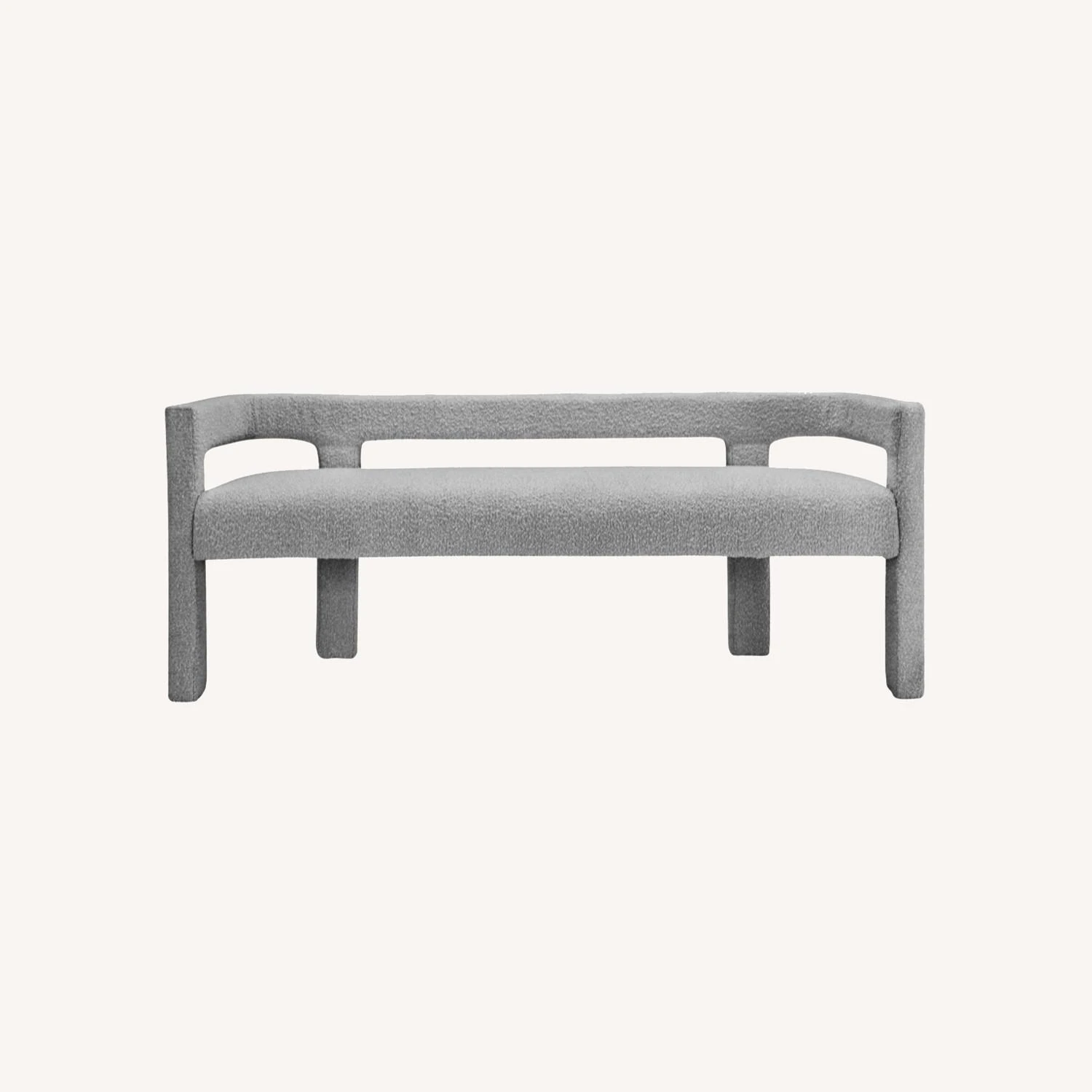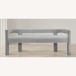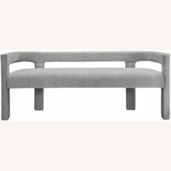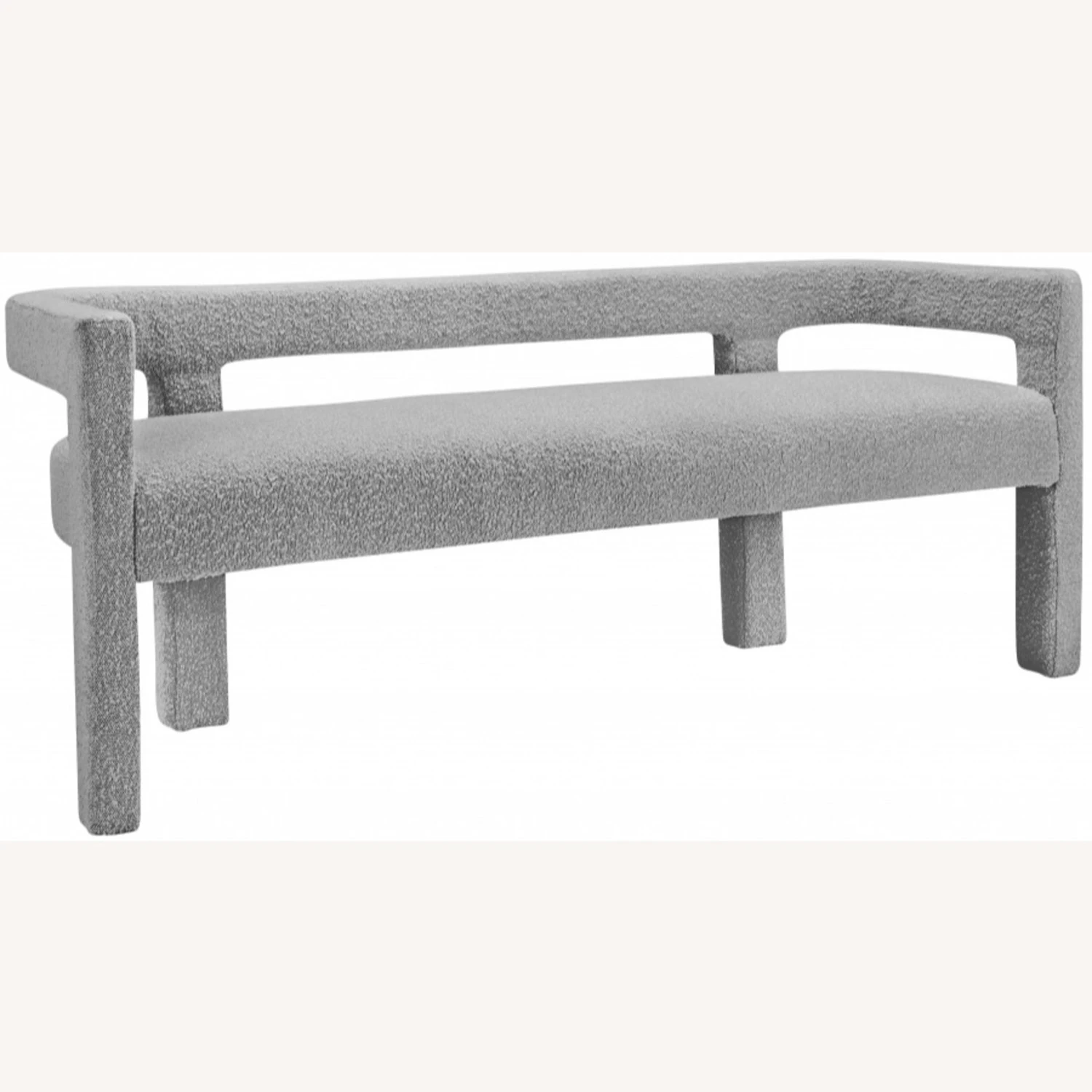 • The bench is covered top to bottom in rich green boucle fabric, so it’s super soft to the touch and elegant to the eye.