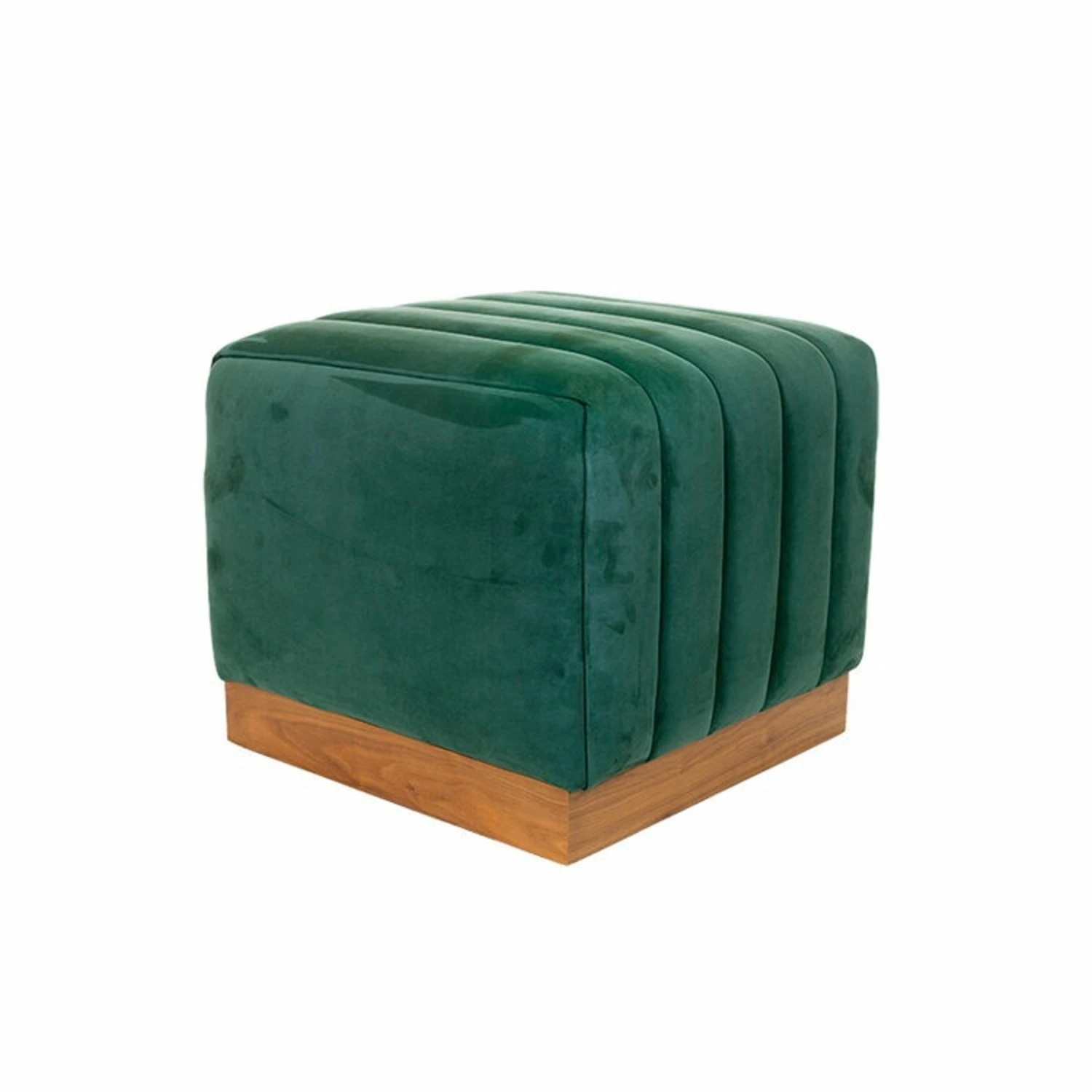 Pair of modern ottomans with a clean silhouette, narrow channel detailing, and walnut 3” base. These fully-upholstered ottomans are covered with a channel upholstered Italian nubuck leather in emerald green.