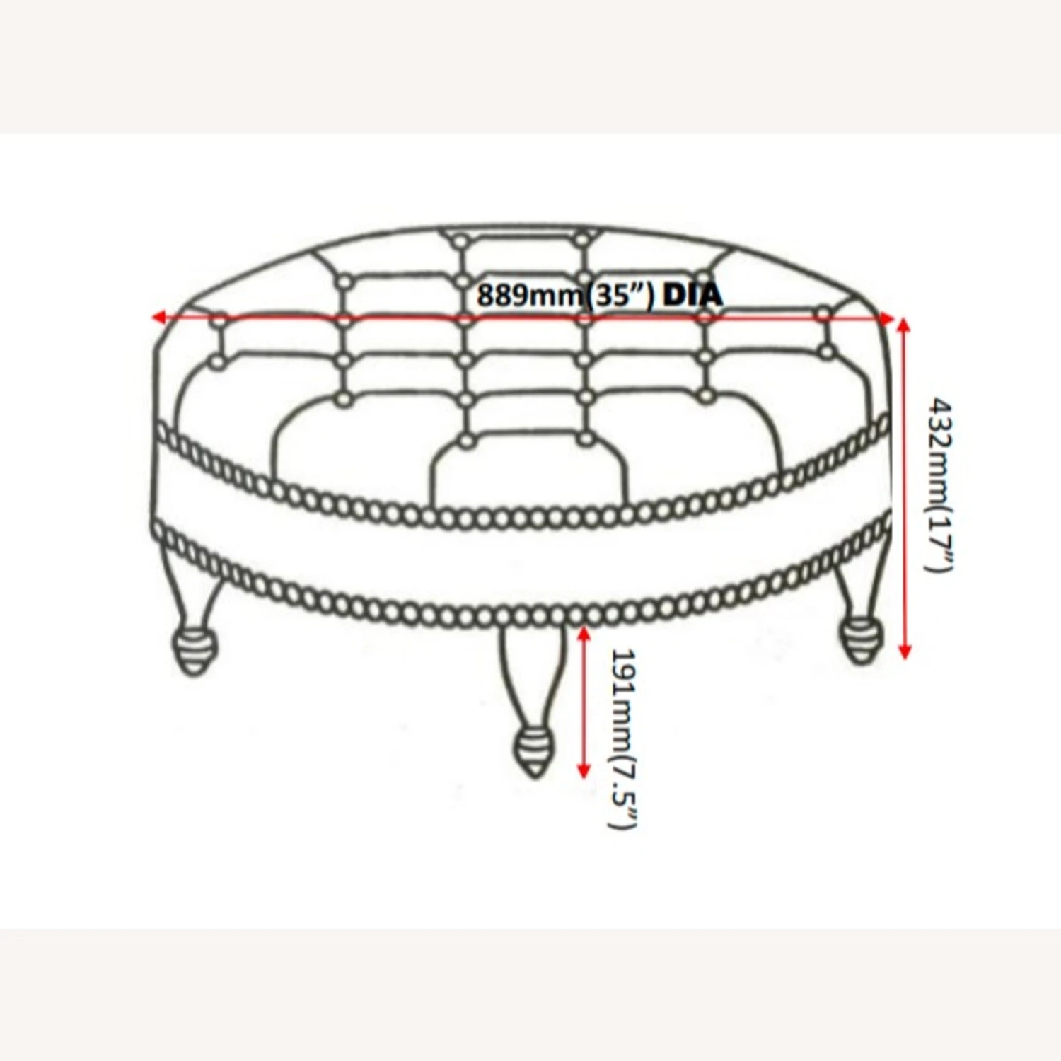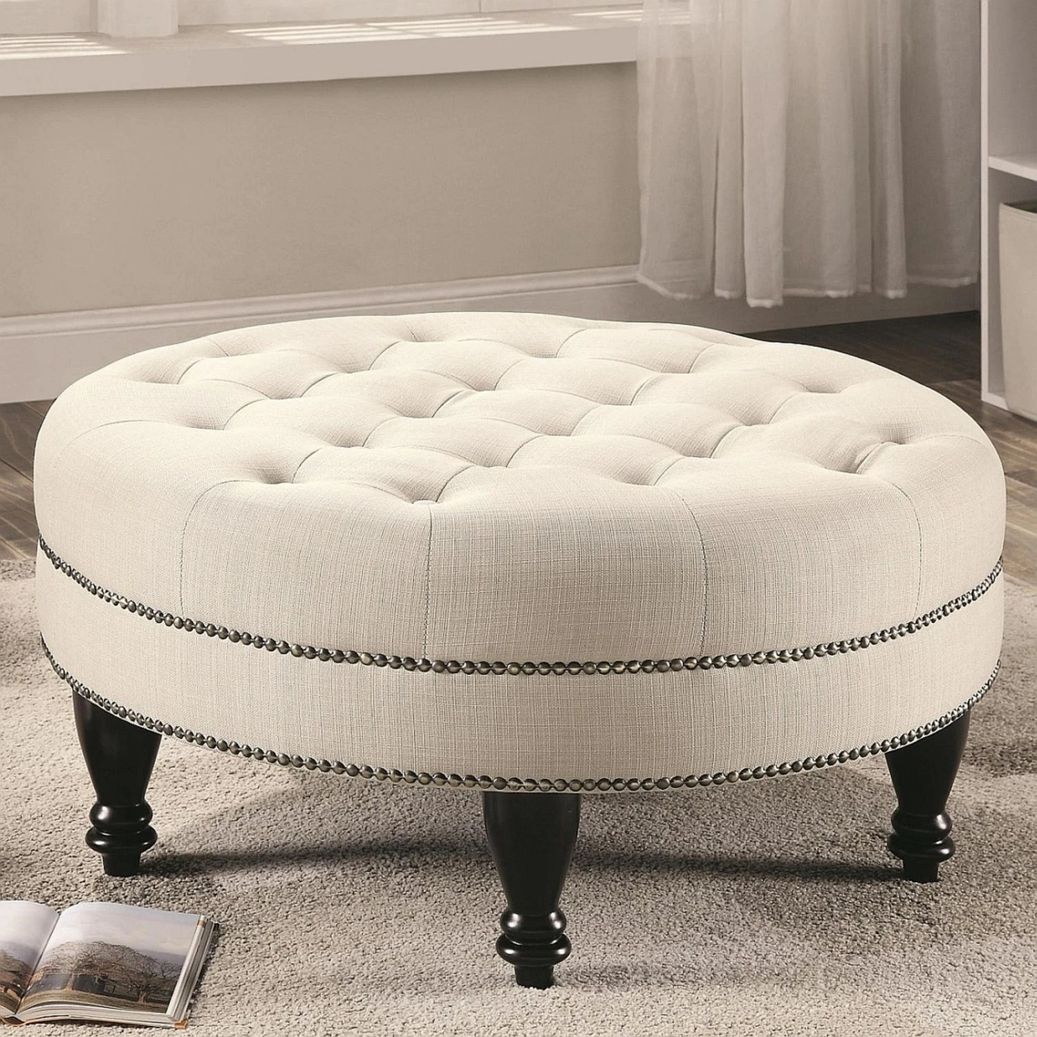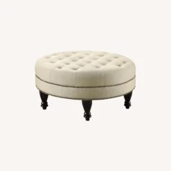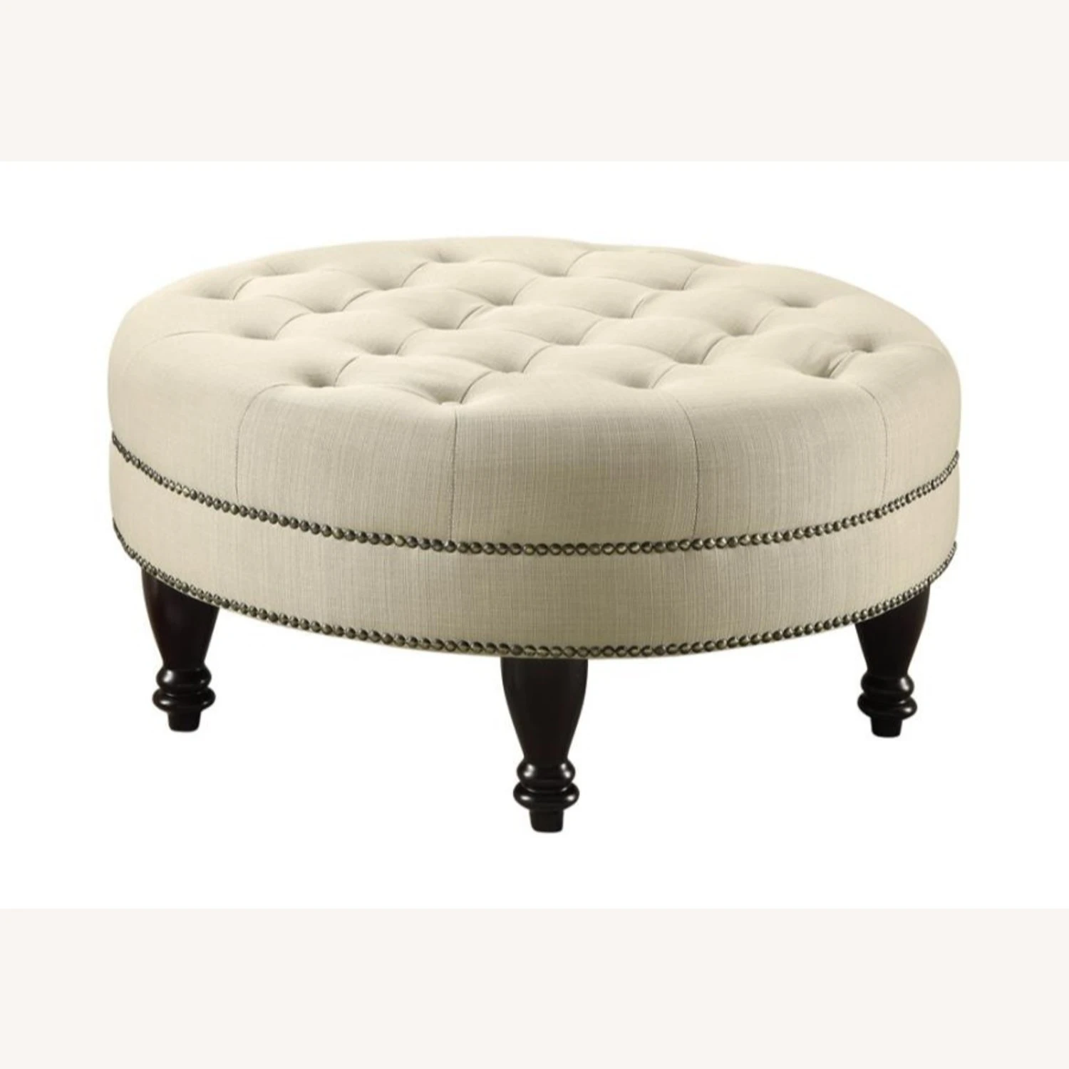 • Round bench upholstered in oatmeal colored linen-like fabric