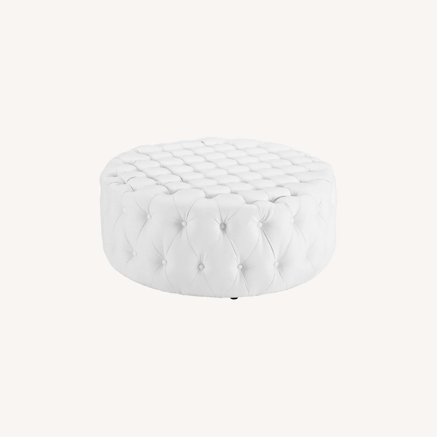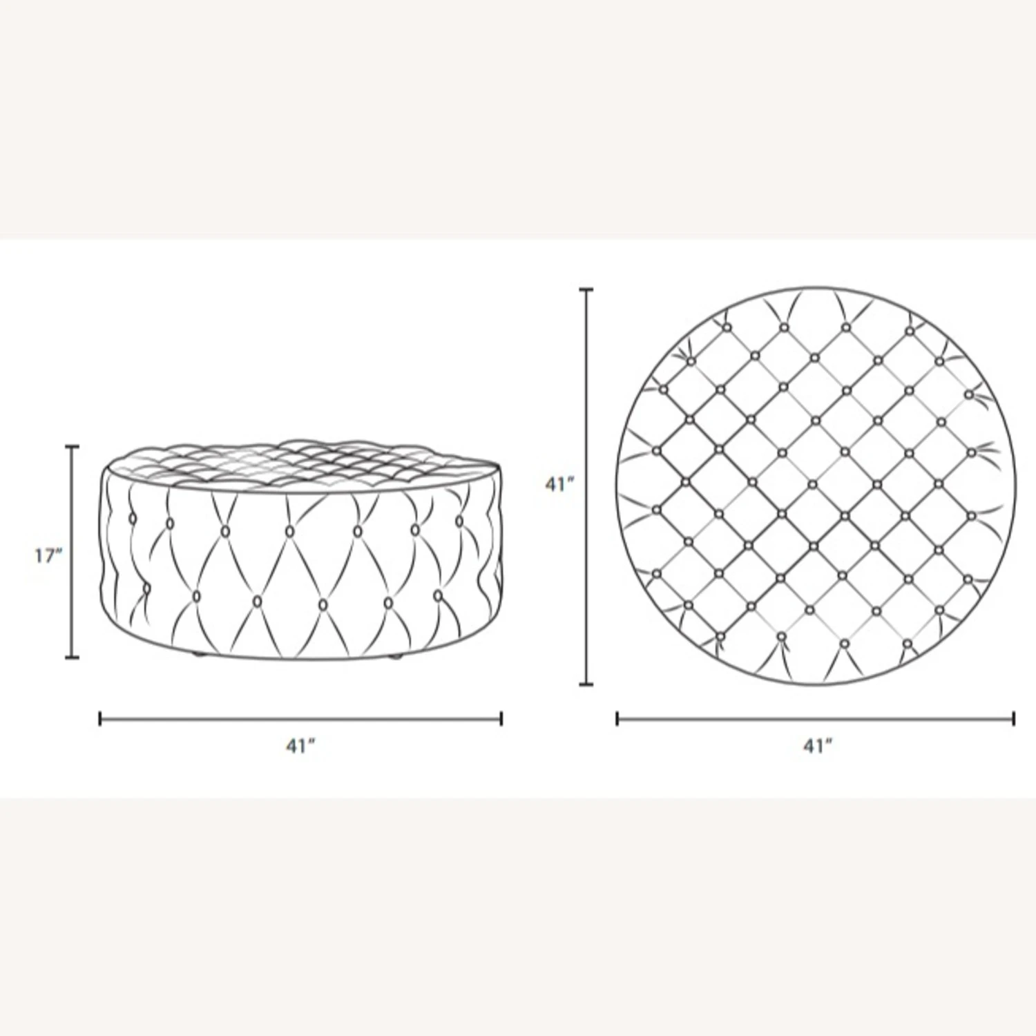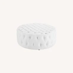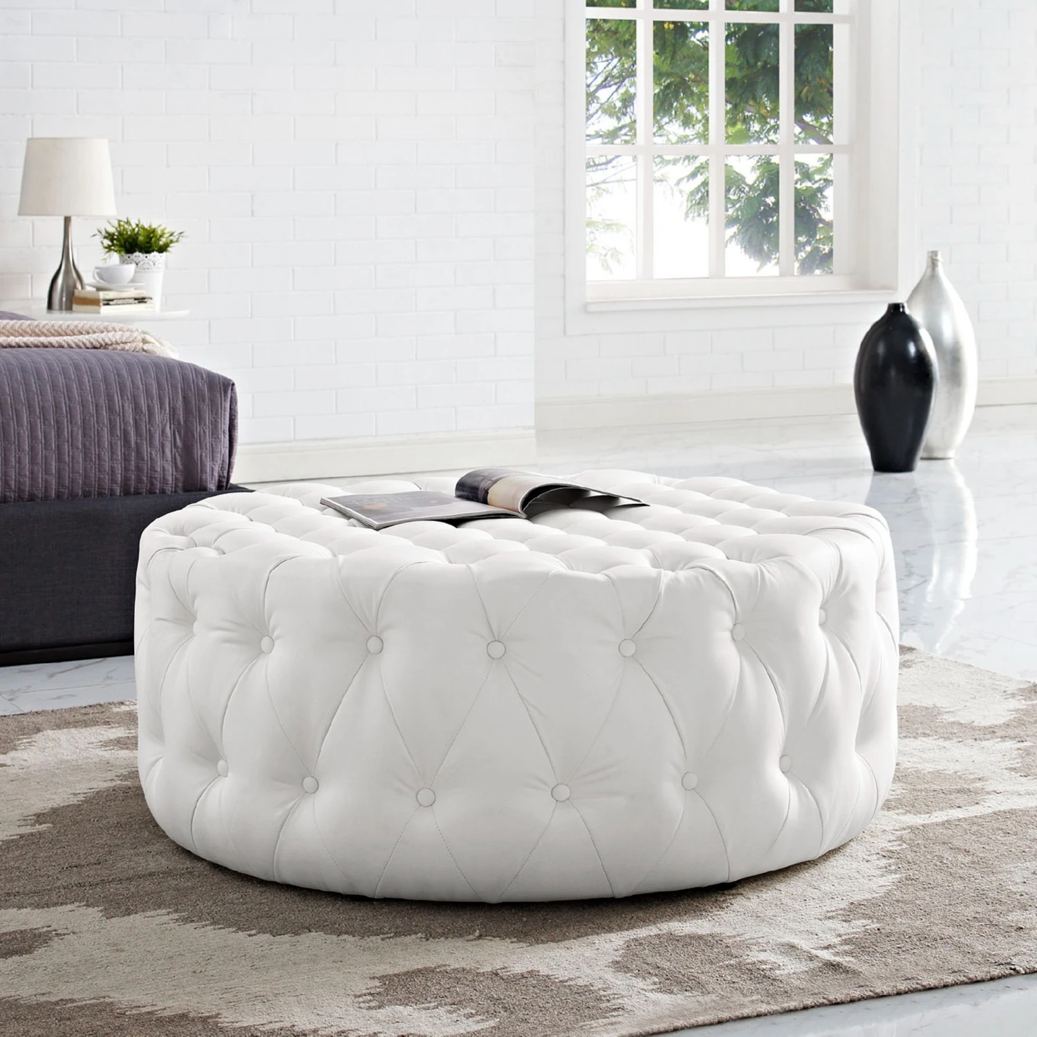 • Fashionably chic with a refreshing look, this ottoman features a luxuriously tufted round design with dense foam padding, fine vinyl upholstery, and non-marking black plastic legs.