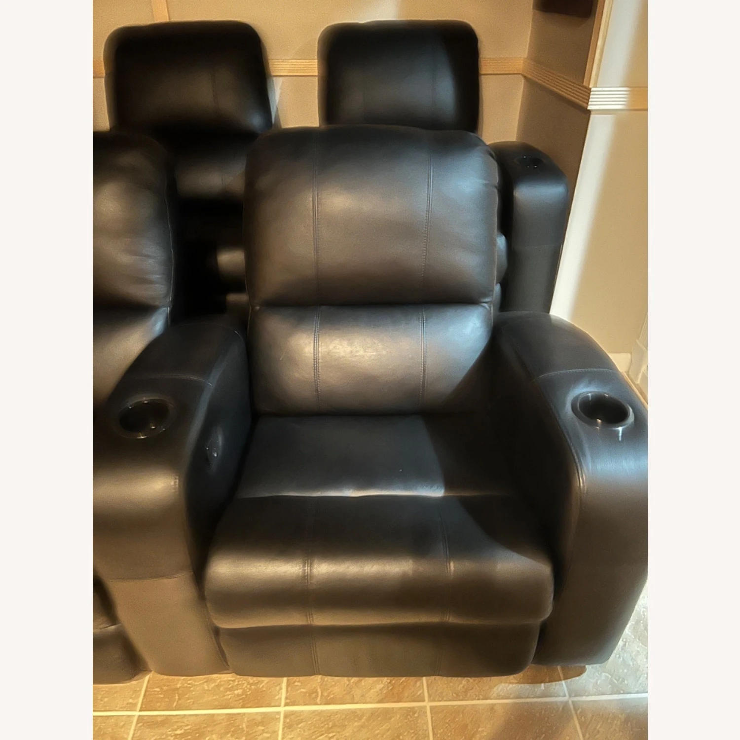 Seller’s Notes: Comfortable theater room seating, 2 rows each chair has its own cup holder chairs recline!