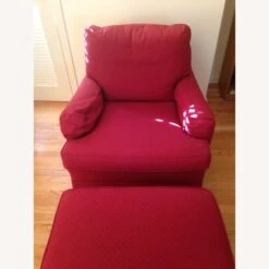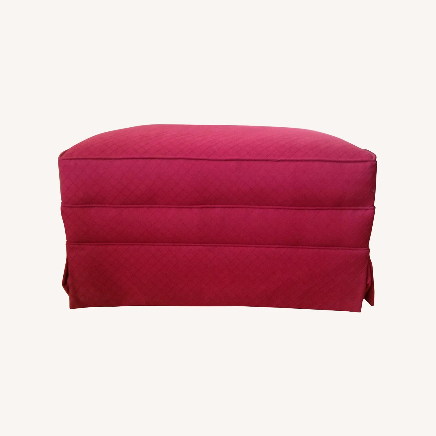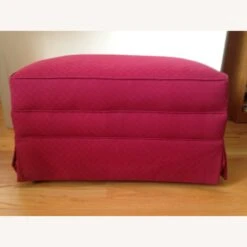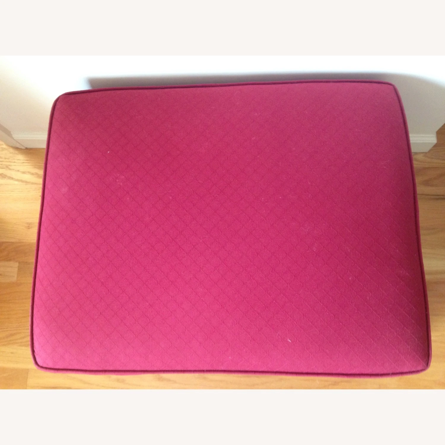 Seller’s Notes: This is an ottoman manufactured by Woodmark and reupholstered with burgundy cotton fabric in 2009. The matching armchair is in a separate listing.