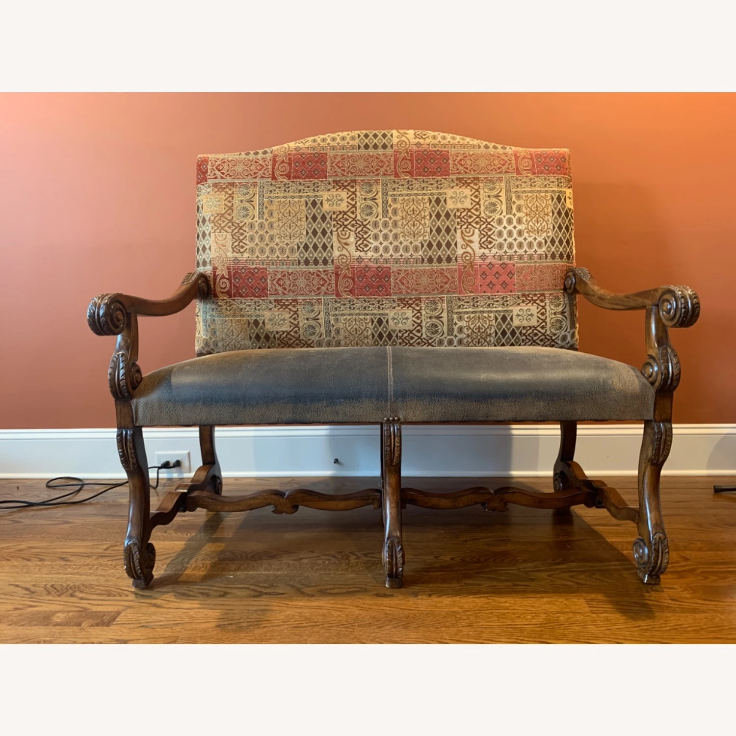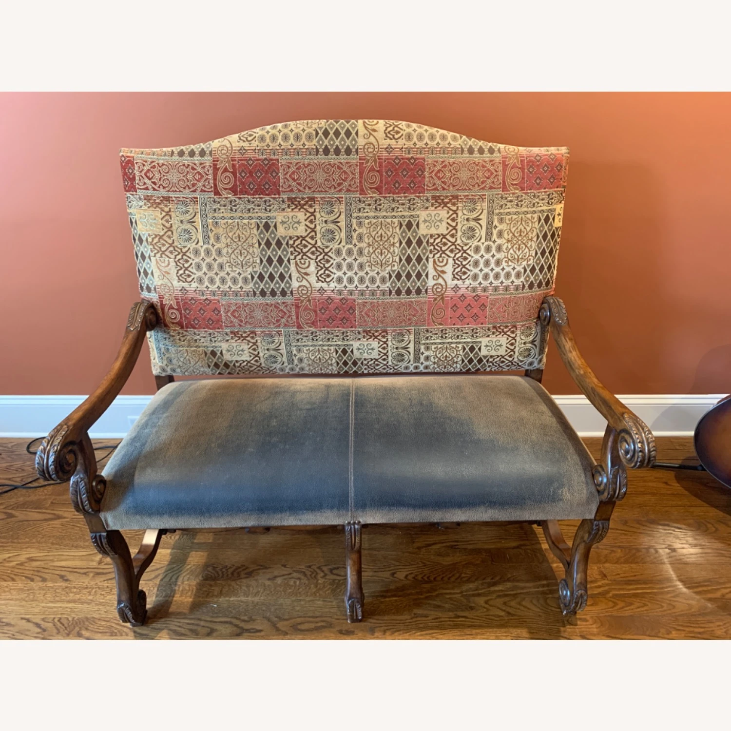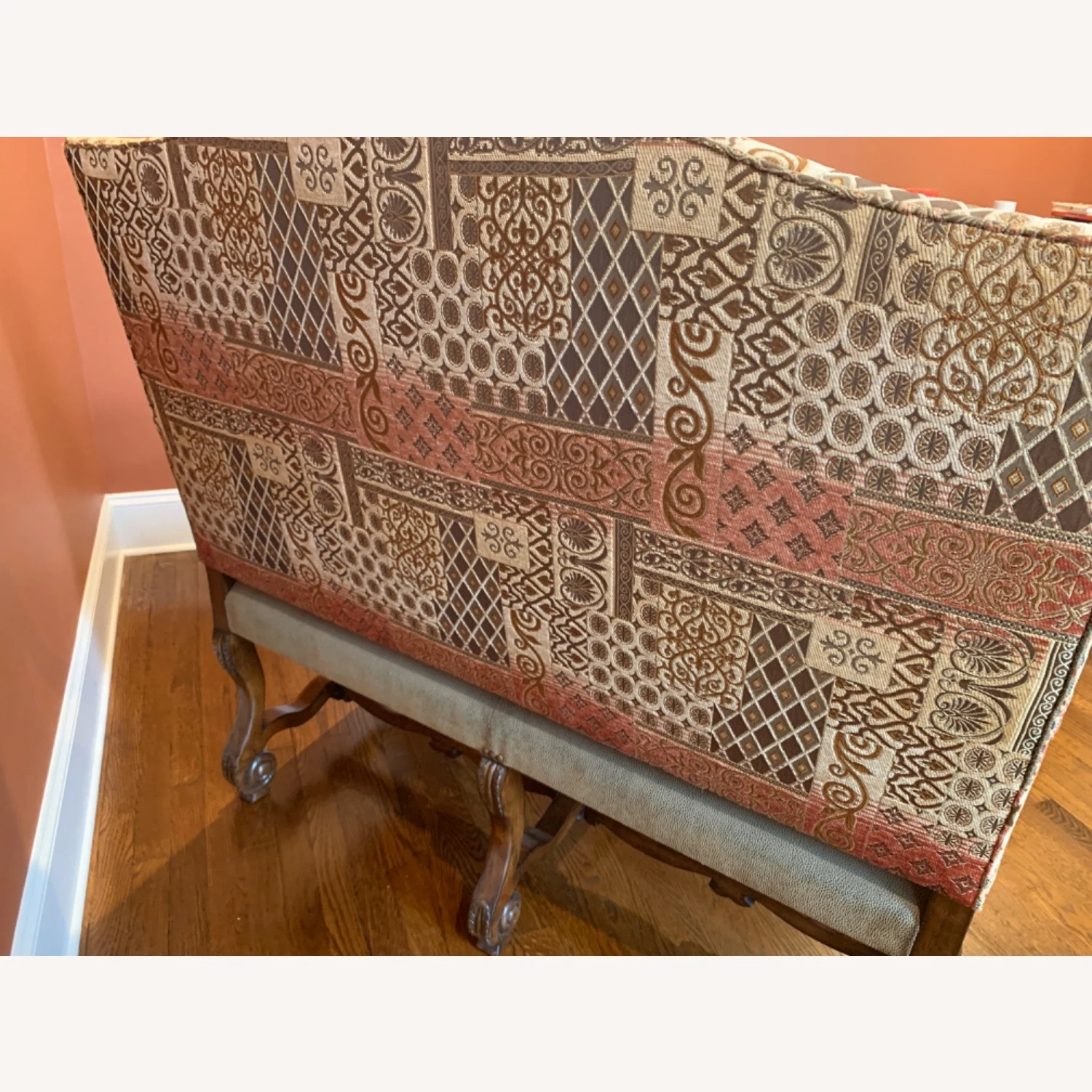 Seller’s Notes: Excellent condition high backed solid wood upholstered bench. Makes a comfortable addition to dining or living room. Some slight fabric fading on the back due to its sitting in front of a window.
