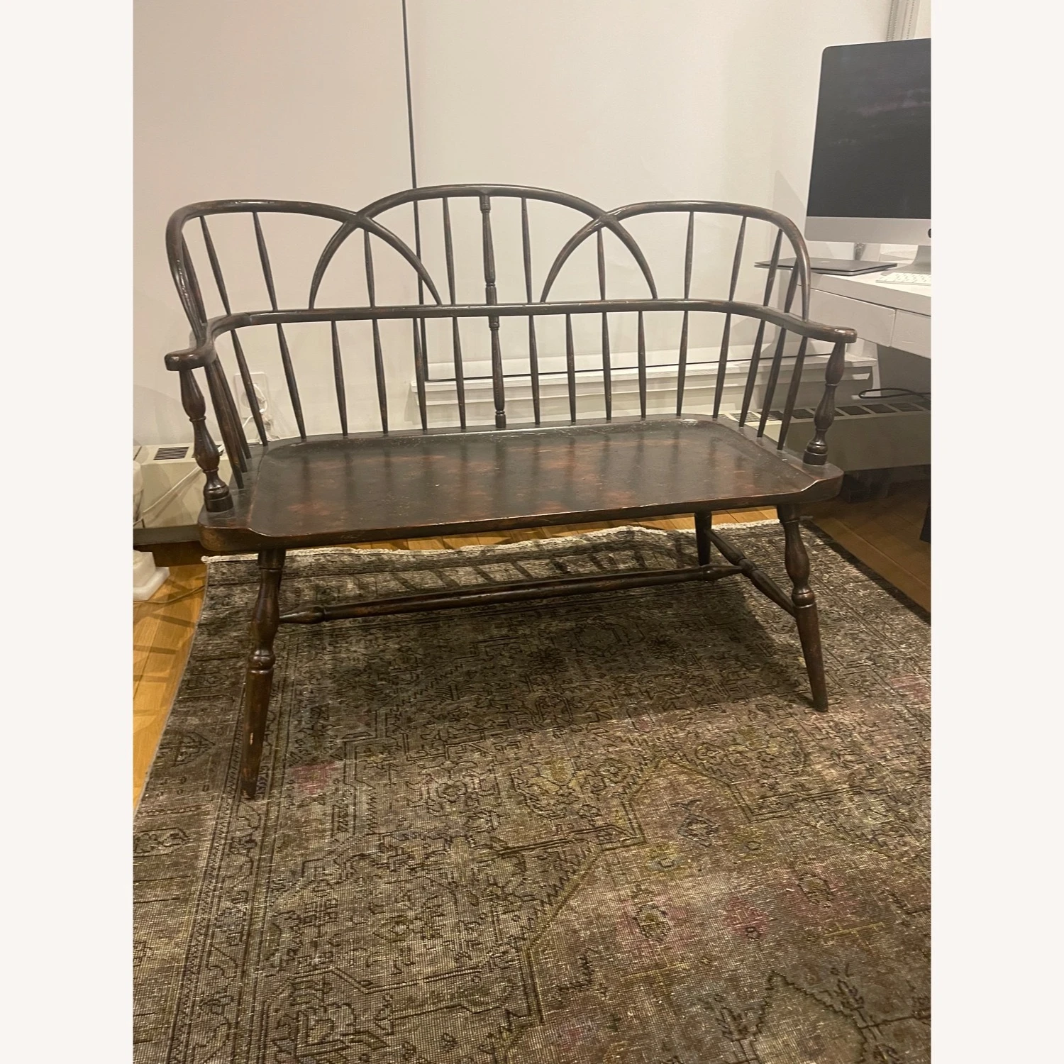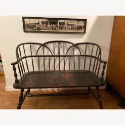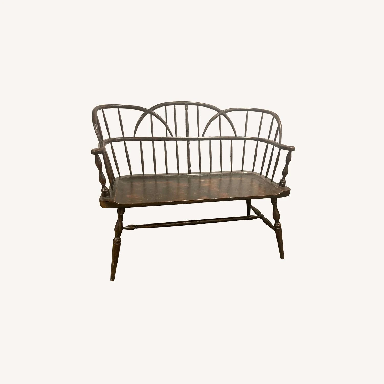 Seller’s Notes: A rustic painted hoop backbench, the triple-arched back with turned slats and arms with turned uprights, the shaped seat above turned splayed legs. Inspired by an 18th century Hickory original.