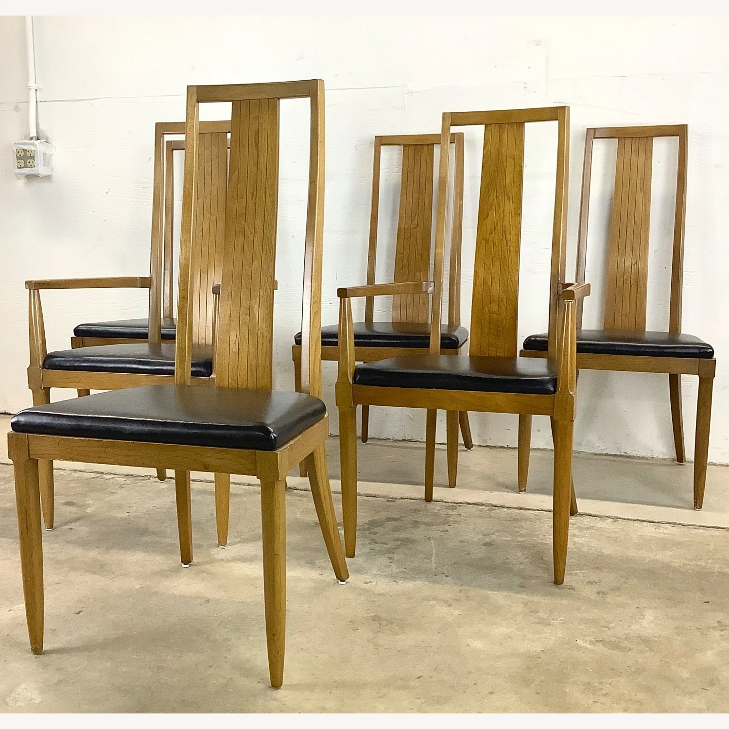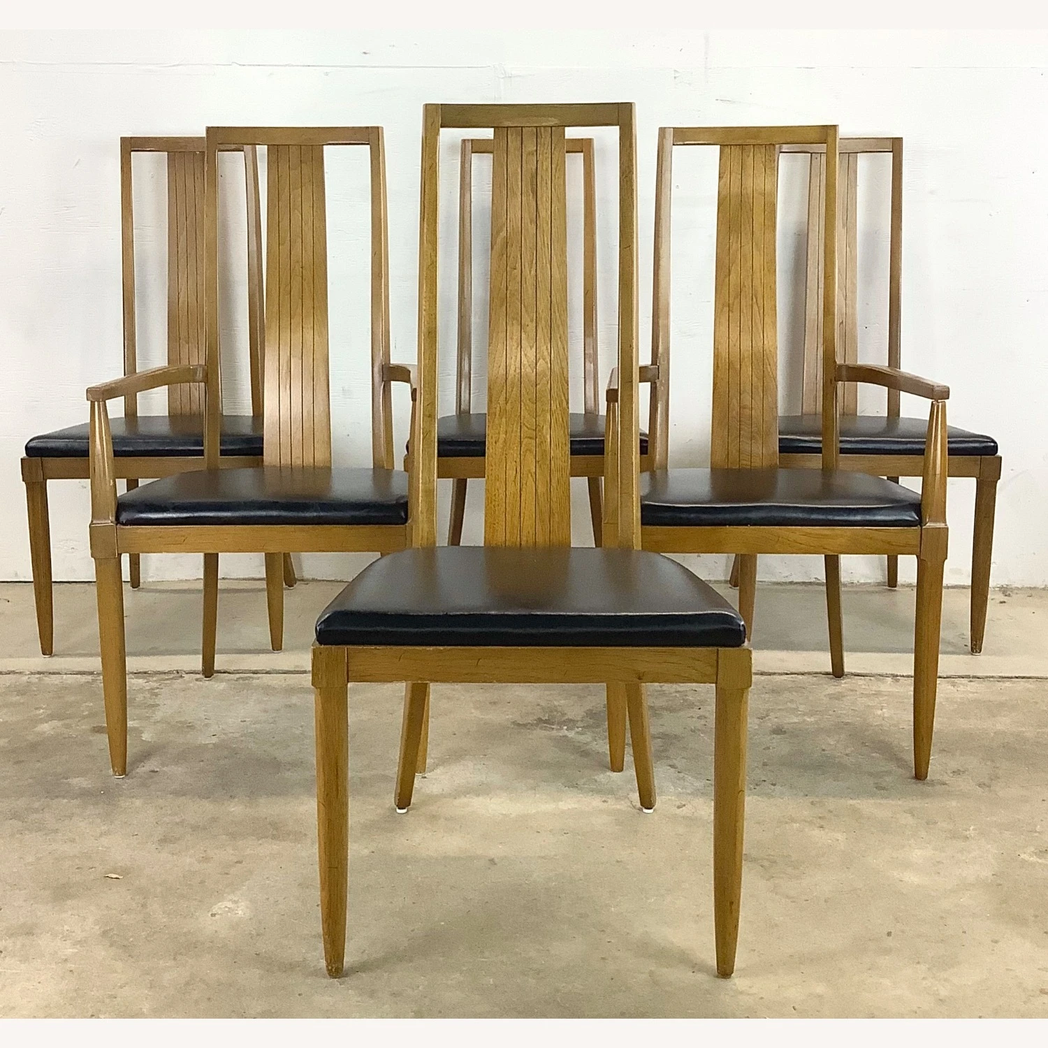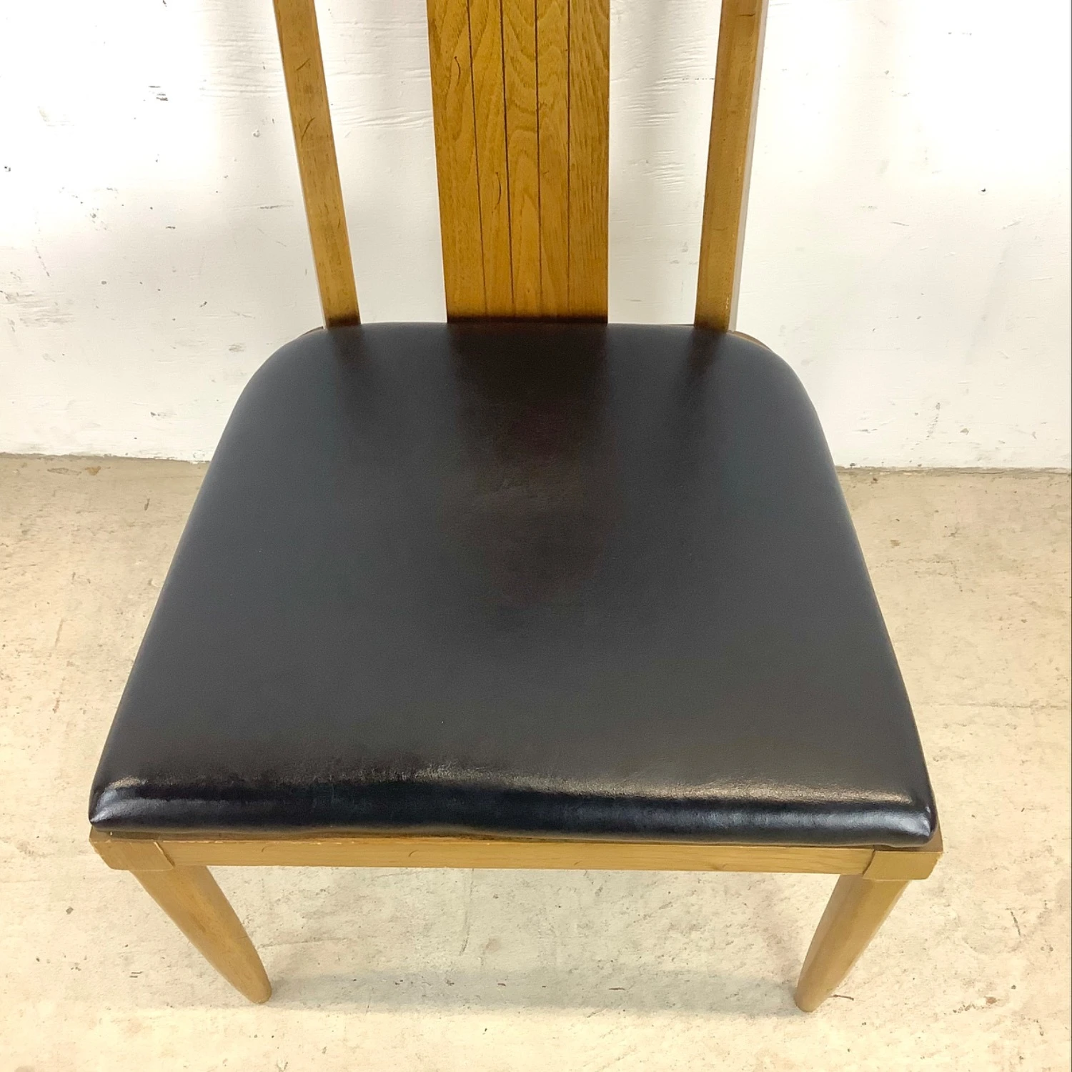Seller’s Notes: This matching set of six dining chairs from the Tomlinson “Sophisticate” line features solid wood chair frames with upholstered seats and tall seat backs. This substantial set of vintage dining chairs makes a striking addition to any dining room or kitchen seating area.