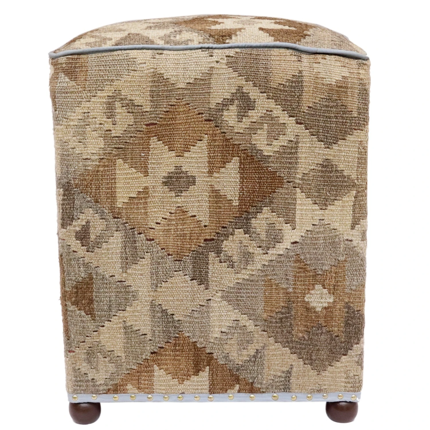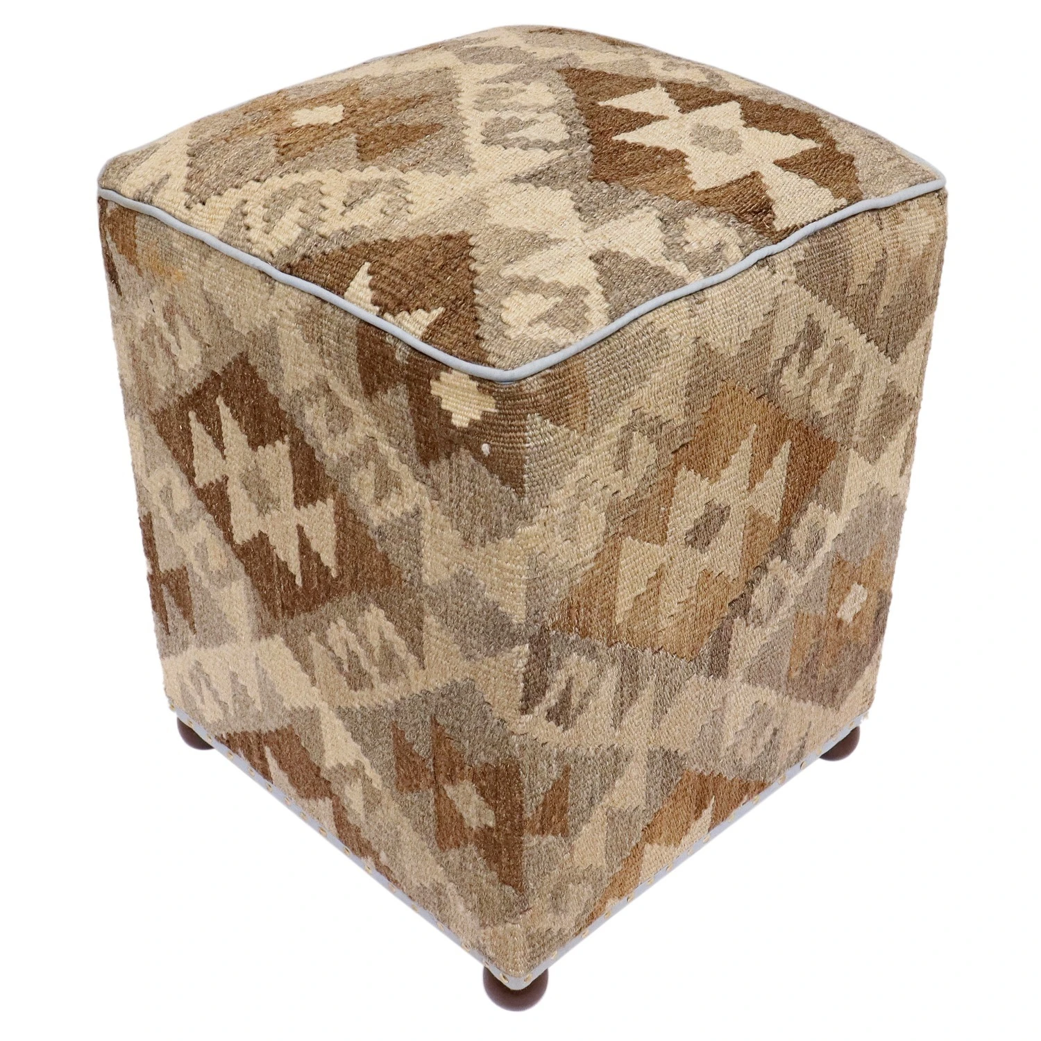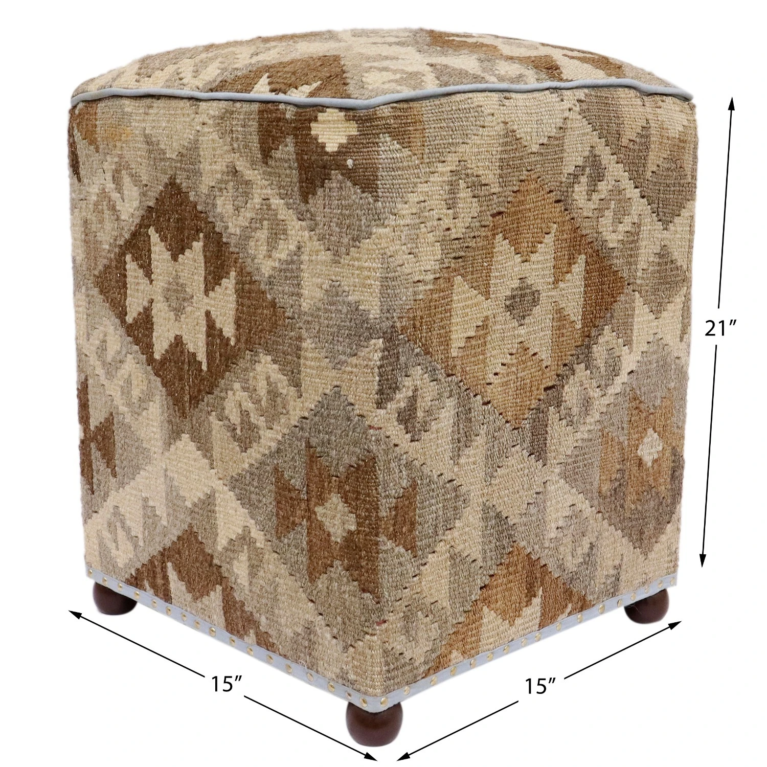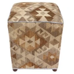 Seller’s Notes: Chic handmade ottoman crafted using wood and upholstered using hand-woven kilim wool rug is a multi-purpose fashion pouf which will add dimension, color and style to your decor. Inspired by geometric motifs in any array of effervescent color pallet grounds any space with elegance and sophistication.